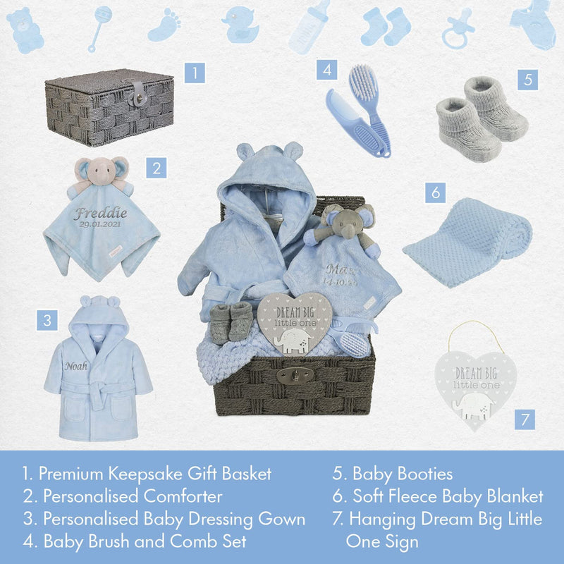 Personalised Baby Gift Basket for Boys Blue Baby Large Gift Hamper - Elephant Comforter, Dressing Gown, Cot Blanket, Booties, Baby Plaque