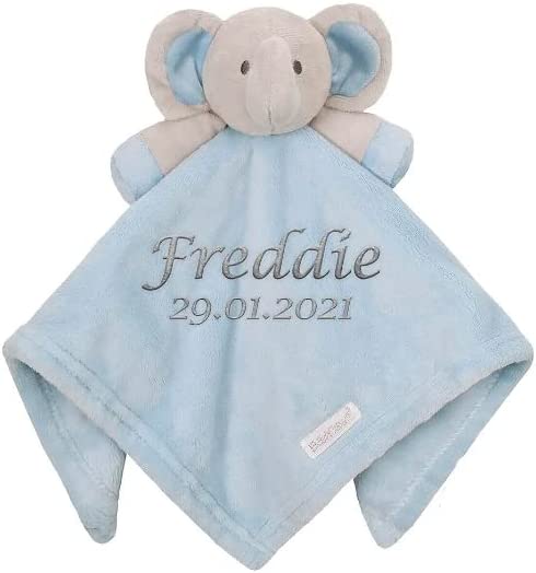 🐘 Personalised Blanket - The blue elephant comforter is personalised in silver embroidery with the name of your choice as shown (max 2 words) these make great keepsake toys a lovely personalised new baby boy gift which will be treasured for many years. suitable from birth.