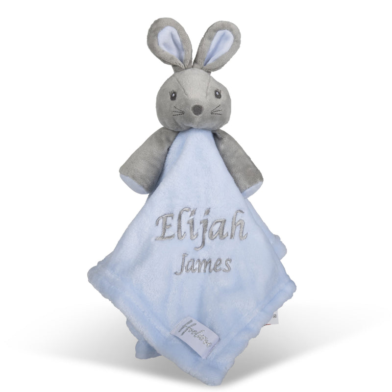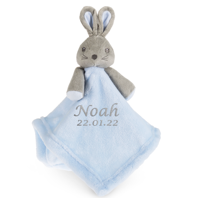 - ♥️ Give The Perfect Newborn Baby Gift, This Elegantly Shaped Baby Boy Gift Box Consists Of Light Blue Personalised Embroidered Bunny Comforter 30cm, Super Soft Fleece Blanket 90x75cm, Pair Of Knitted Booties, Size When Wrapped 20x24x11cm.