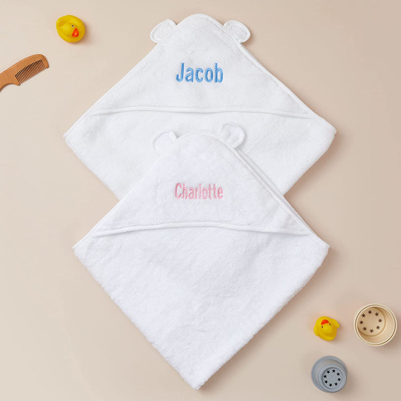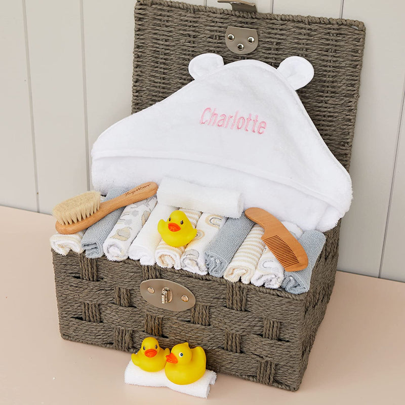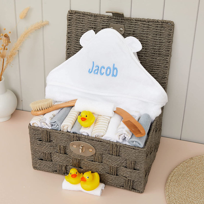 Personalised Baby Bath Box Gift Set Personalised Baby Towel, 12 Wash Cloths, Wooden Hairbrush Set Duck Bath Toys Boy Girl Newborn New Baby Gift Present Grooming Essentials Hamper