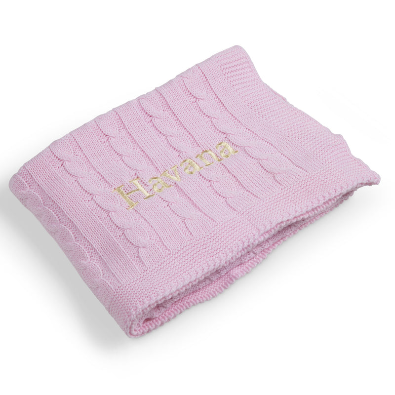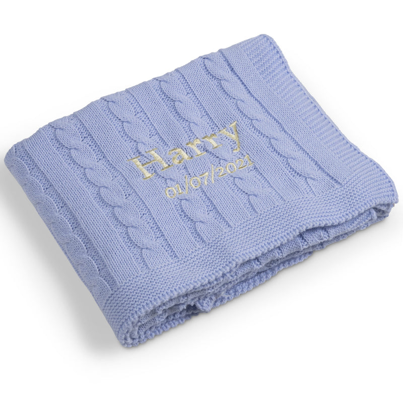 - Keep Little One’s Wrapped Up Warm With Our Personalised Embroidered Blanket. Luxuriously Soft And Featuring A Classic Cable Knit Pattern. The blanket measures 75 x 80cm so the perfect size for pram or cot.