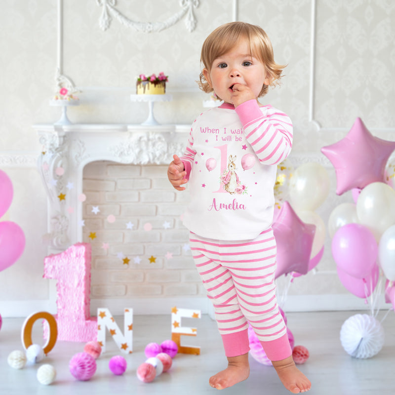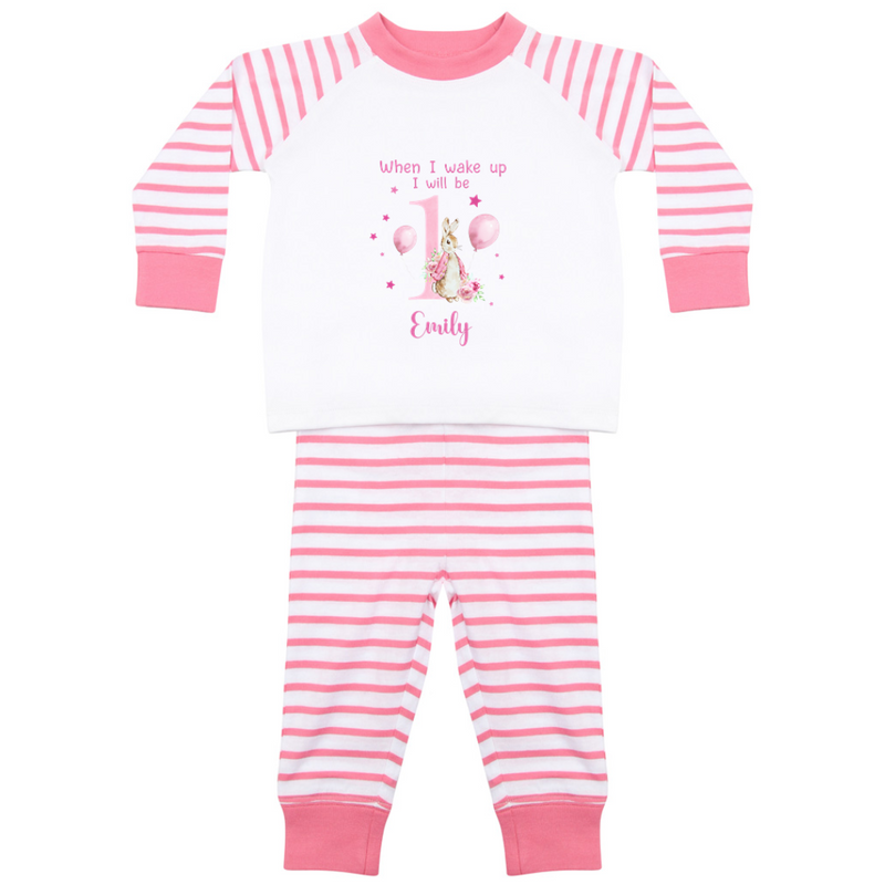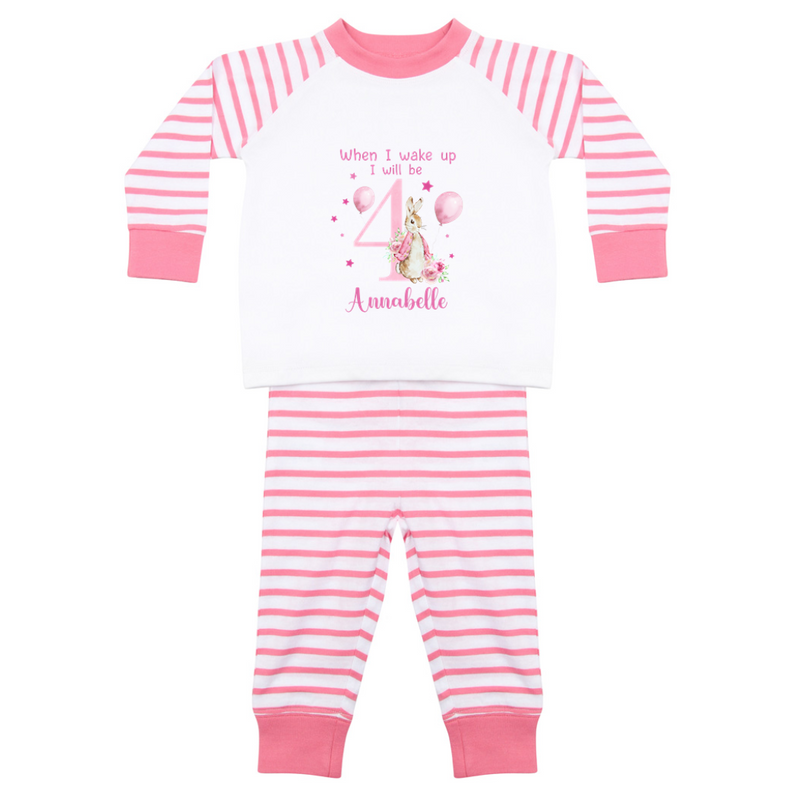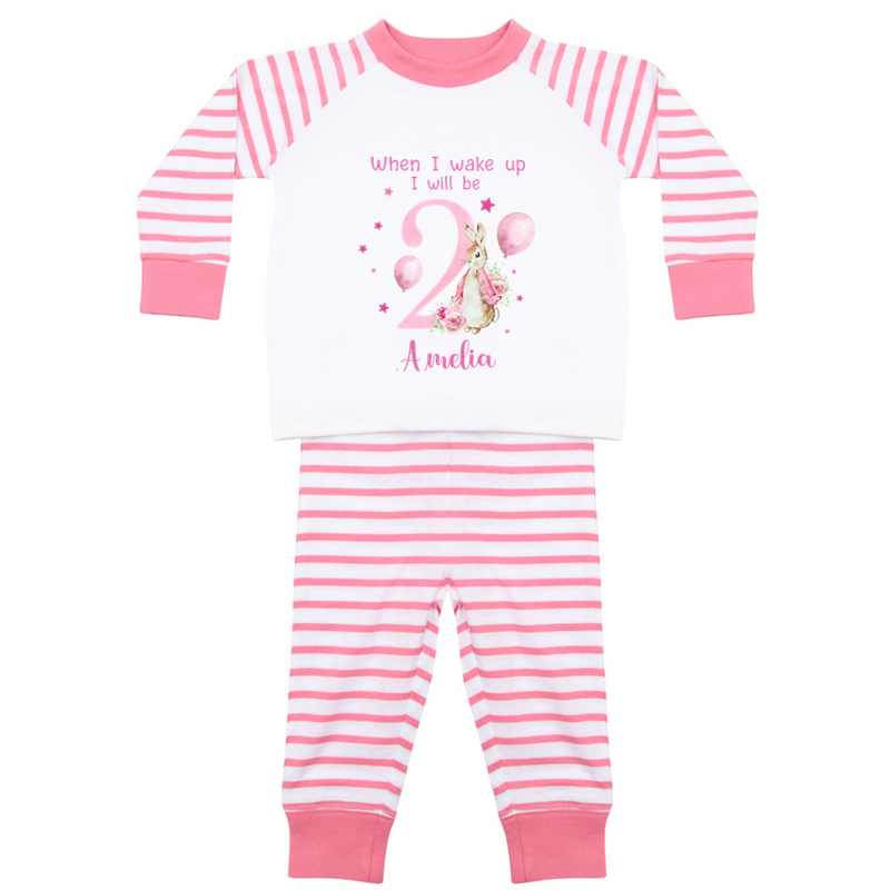 Personalised Baby Toddler Pyjamas - When I Wake Up I'll Be 1 2 3 4 Birthday PJs - Pink Bunny For Girls, 6 Months - 4 Years
