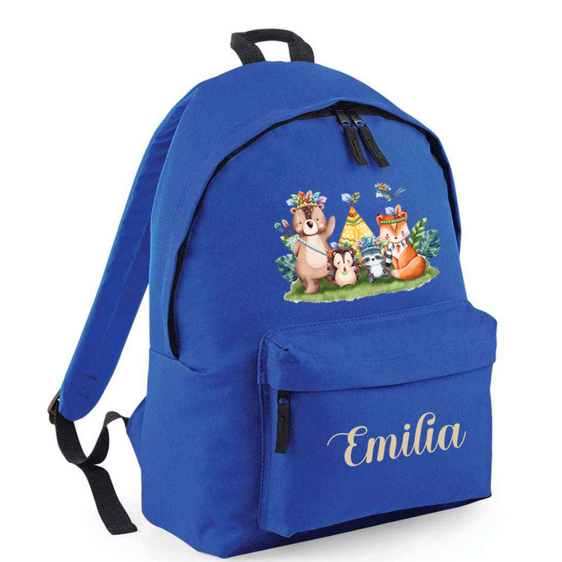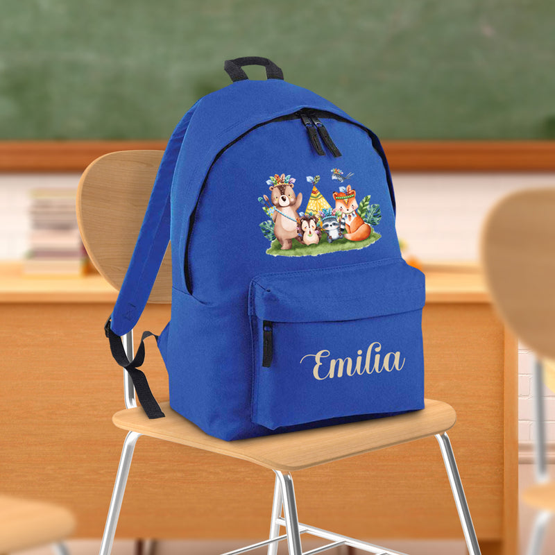Personalised Boho Forrest Animals Backpack for Boys and Girls Large 18L Kids Rucksack Royal Blue Design School Bag for Nursery and Toddlers Customisable Children's Baby Pack 42x31x21cm