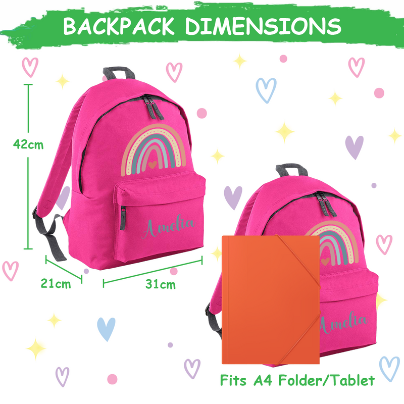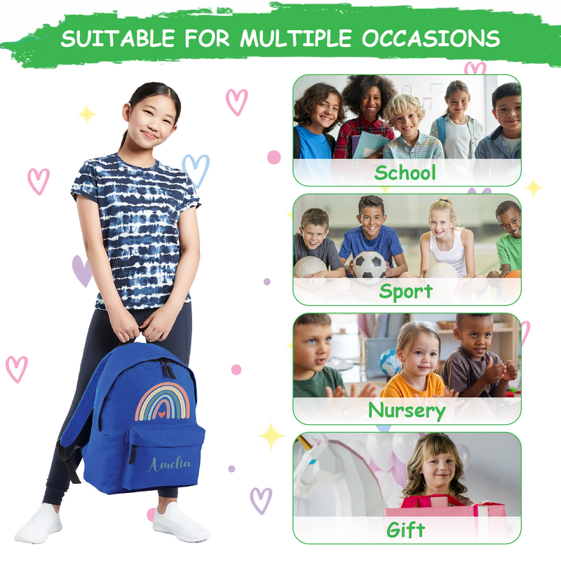 🌈 Backpack for Girls Express Your Unique Style: Let your little girl's personality shine with our Boho Rainbow Backpack. Featuring a beautiful rainbow design, it adds a pop of colour and a touch of magic to her everyday routine. This personalised backpack is a great way to make her feel special and stand out from the crowd.