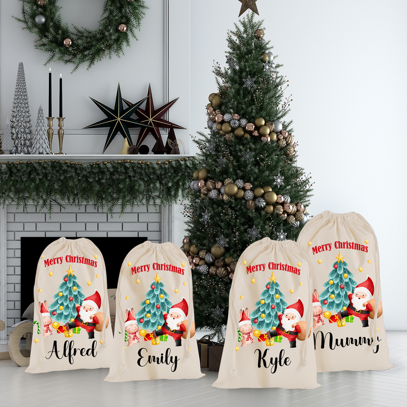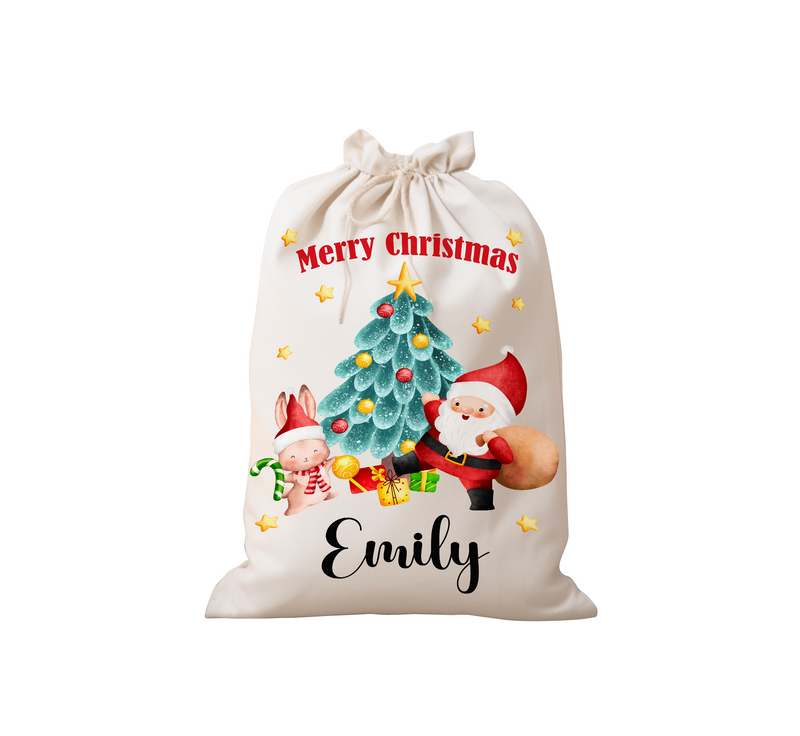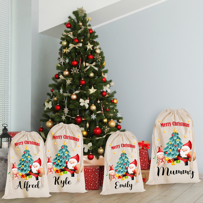 Personalised Christmas Santa Sack – Santa & Tree Design – Name & Initial - Xmas Gift Bag – 4 Sizes