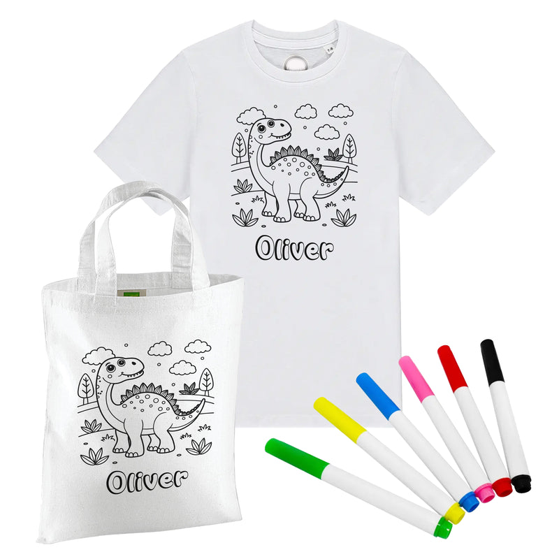 Personalised Colouring in T shirt, + Colour Your Own Bag, Washable Pens, Design Your Own Tshirt, Dinosaur Gift For Boys