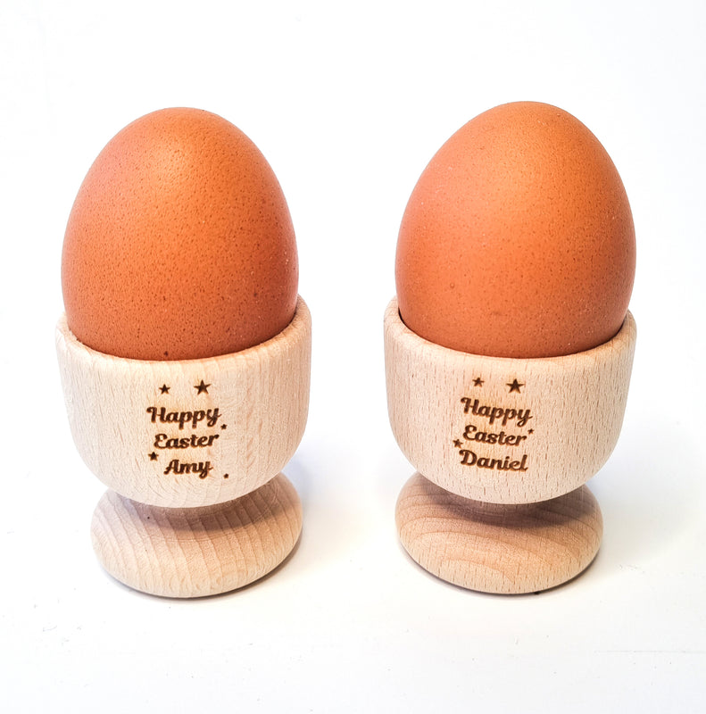 Personalised Egg Cups - x2 Pack - Wooden Easter Egg Holder Personalised Easter Gifts Engraved Boiled