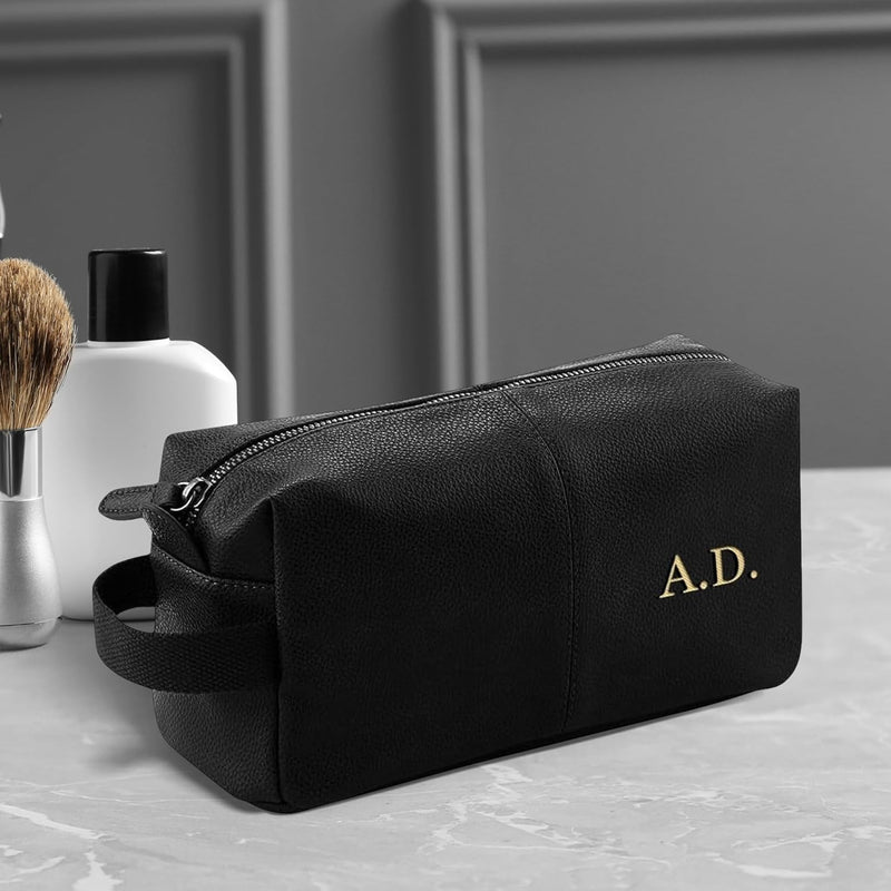 Faux Leather leather wash bag exudes elegance and sophistication, making it the perfect accessory for any man on the go. It is spacious enough to hold all your grooming essentials while keeping them organized and easily accessible. The personalized embroidery adds a special touch, making this set truly unique and memorable.