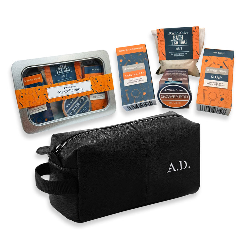 Indulge in a luxurious grooming experience with our Personalised Embroidered Vegan Leather Wash Bag Gift Set. This exquisite set includes a handcrafted leather wash bag, a bar of handmade shaving soap, and a refreshing natural bath shower gel. Whether you are treating yourself or looking for a thoughtful present for Him, Dad, or Brother, this gift set is sure to impress.