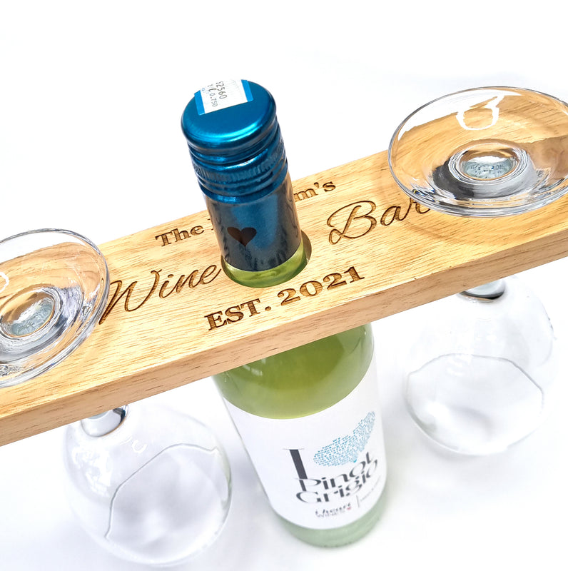 - 🍷 Personalised Wine Bottle - This wooden holder makes a lovely added personal touch to a bottle of wine. Engraved with the details of your choice Top and Bottom (wine and glasses not included) .