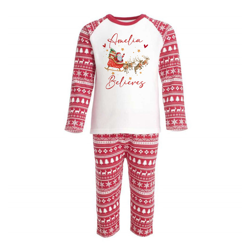 Personalised Christmas Pyjamas for Kids & Toddler Xmas PJs Believes Santa Sleigh Design PJs