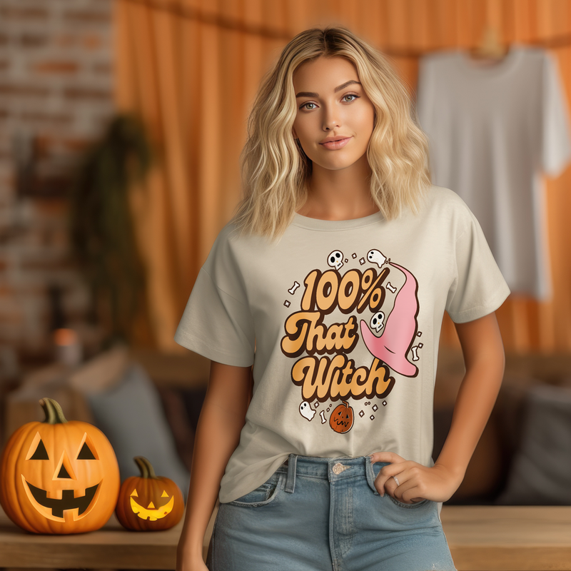 This Retro Halloween Women's T-Shirt Gift is the perfect way to show your spooky spirit this season! Featuring a seasonal design with 100% That Witch, this t-shirt is sure to make a statement. The soft and lightweight fabric is comfortable to wear and the classic fit is flattering on any body type. The vibrant colors and bold design will make you stand out in any crowd. Plus, the durable construction ensures that this t-shirt will last for years to come.