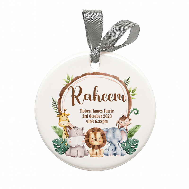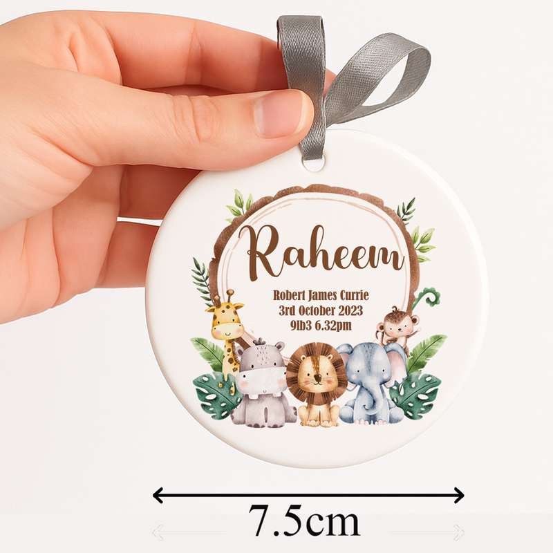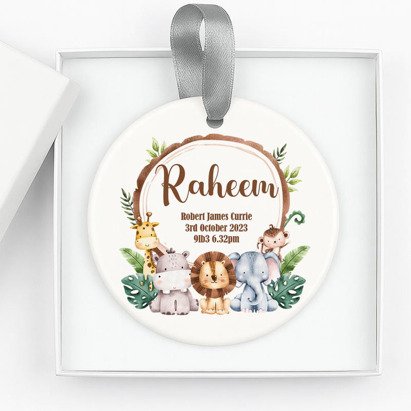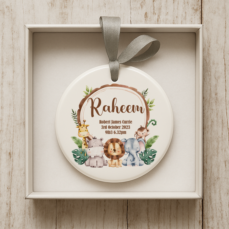 Personalised Christening or Baptism Bauble Hanger – Jungle Theme Momento – Custom Gift Box for Baby Boys & Girls Unique Keepsake Decoration for Naming Day, Babies, Children and Newborns