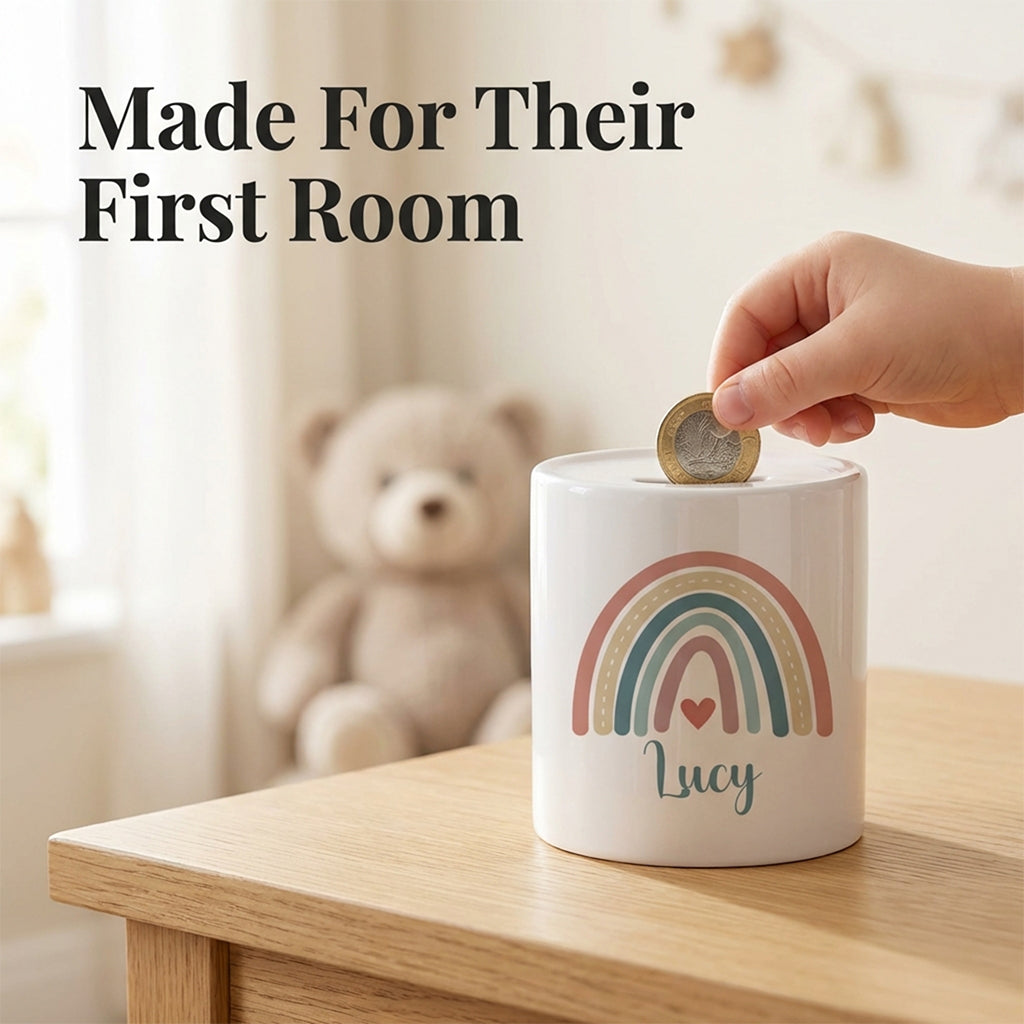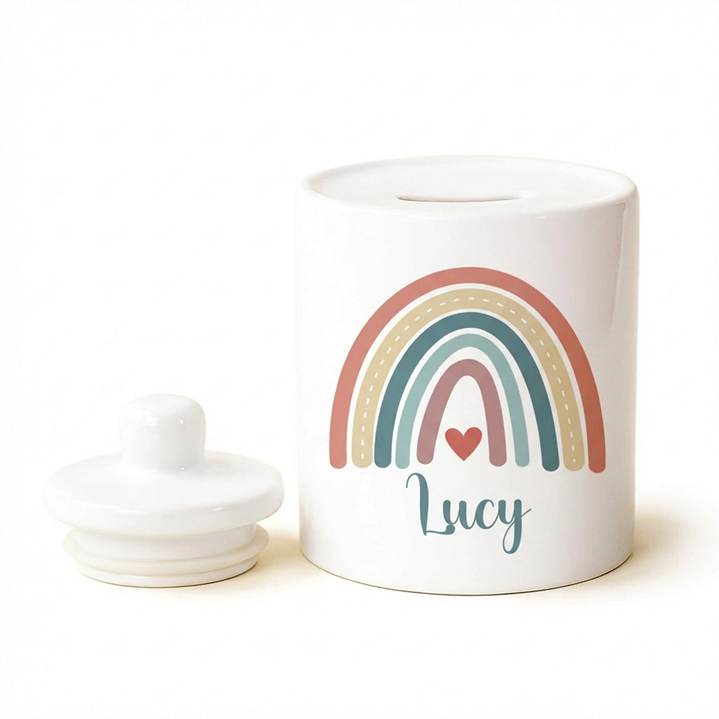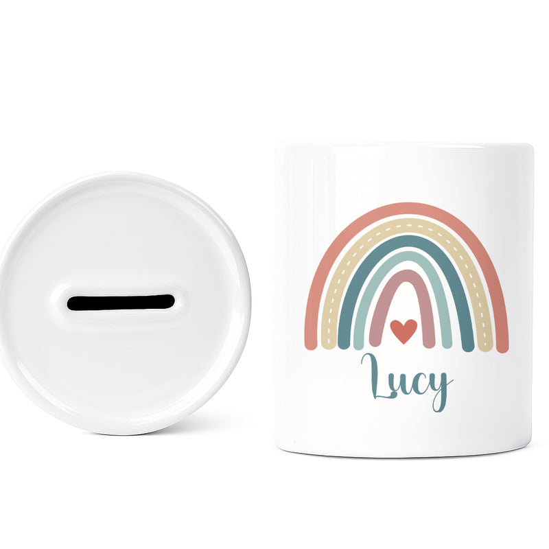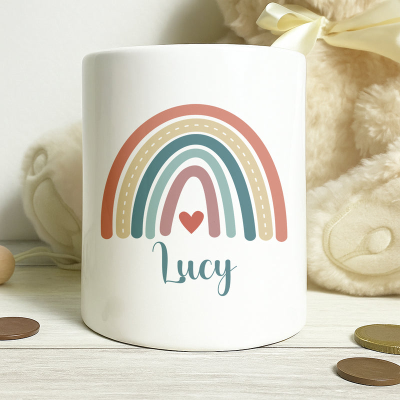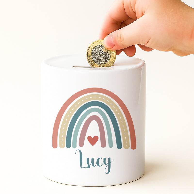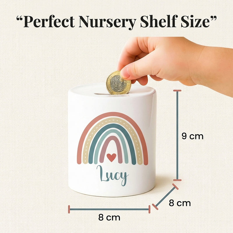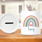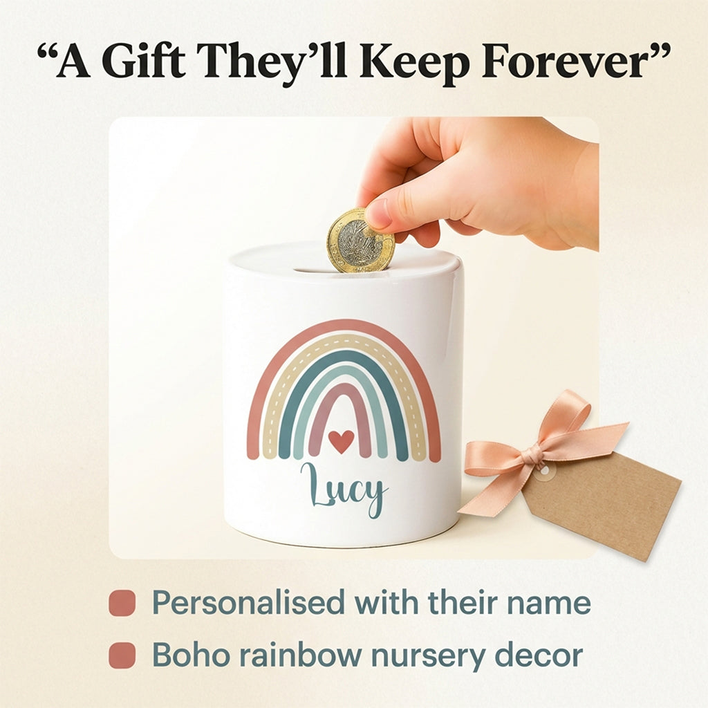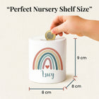 Personalised Money Bank Boho Rainbow Design – Kids Money Box Customised Gift for Baby or Child – Unique Girls or Boys Nursery Keepsake