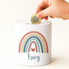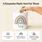 This kids money box features a soft boho rainbow design and can be customised with your child’s name, creating a meaningful keepsake that's perfect for celebrating any special occasion.