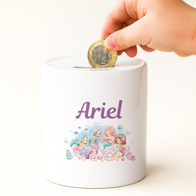 🧜 Personalised Money Bank for Girls – A custom name feature makes this under the sea piggy bank a treasured keepsake, offering both a fun savings solution and a unique decorative item for your child's room.