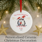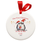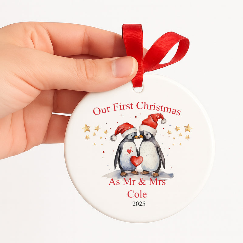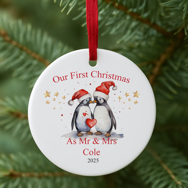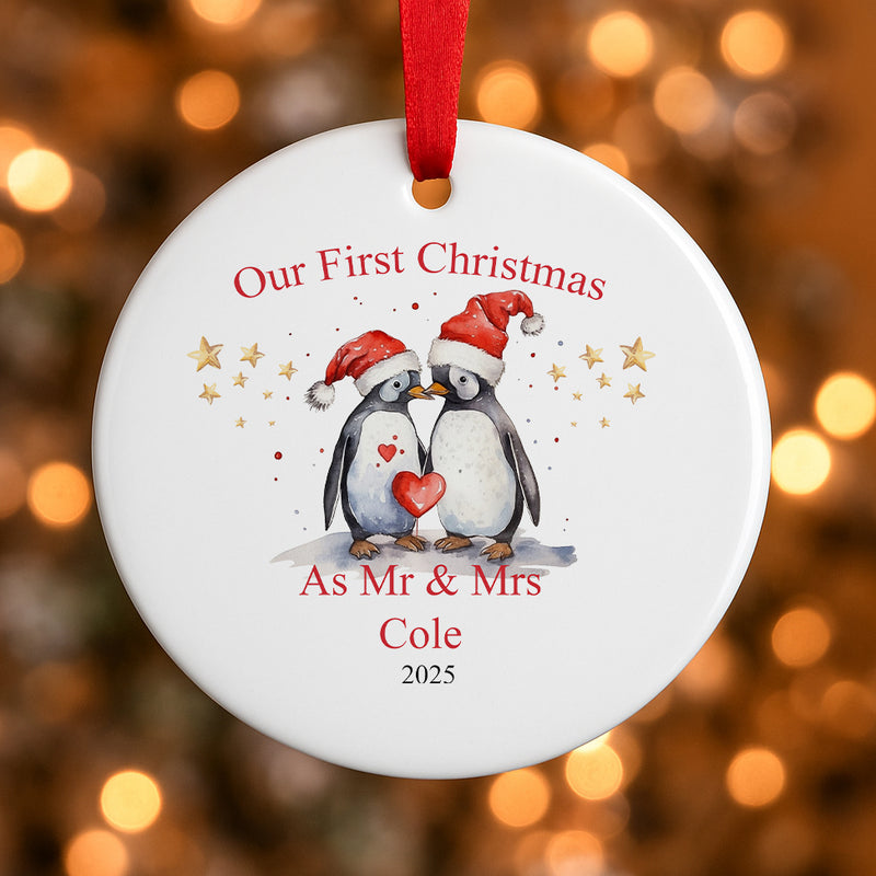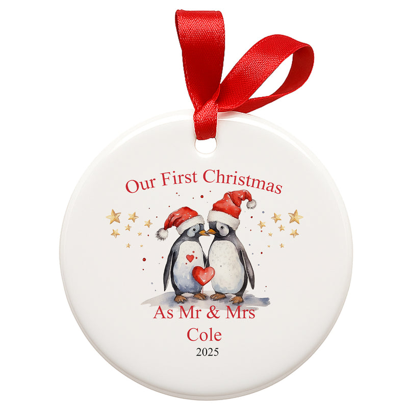 2. Adorable Penguin Couple Design – Add a touch of charm and playfulness to your tree with our custom bauble featuring two cute penguins, symbolizing love and partnership during your first festive season.