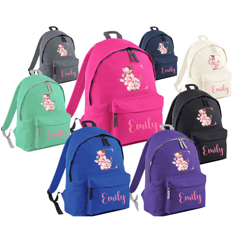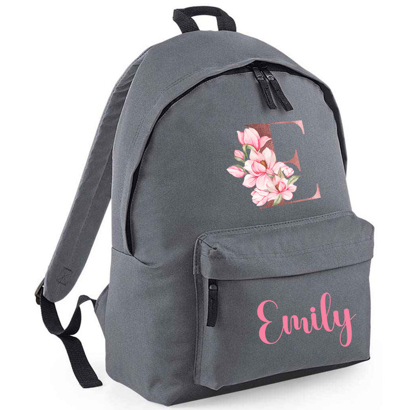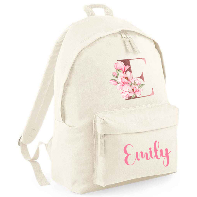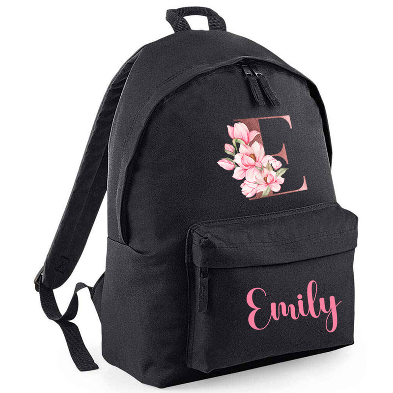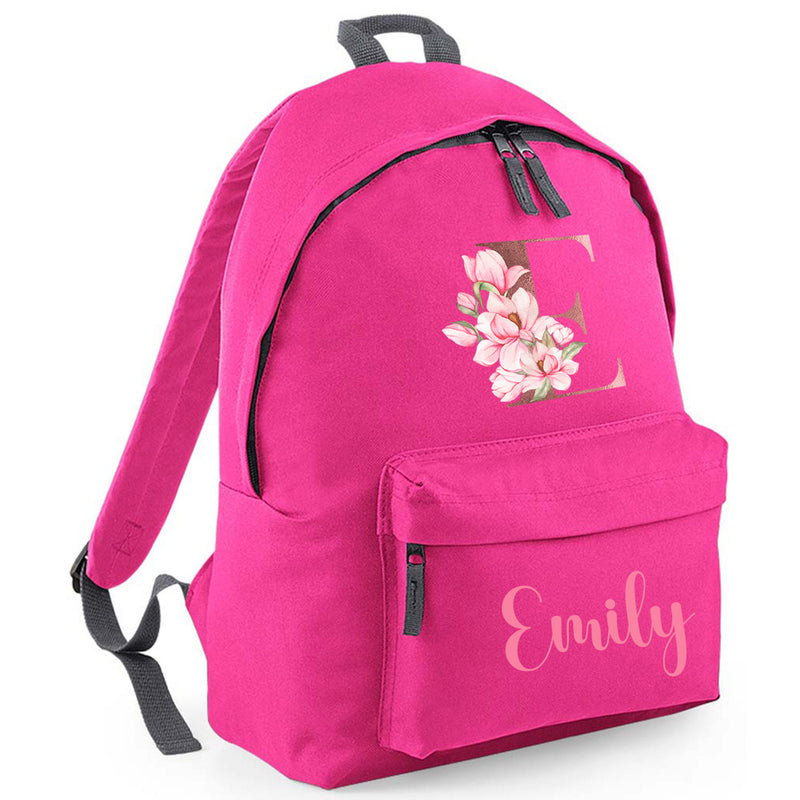 Personalised Floral Letter Initial Backpack for Girls Large 18L Kids Rucksack School Bag for Age 8 9 10 Teenager Pink Customisable Children's Pack Name 42x31x21cm