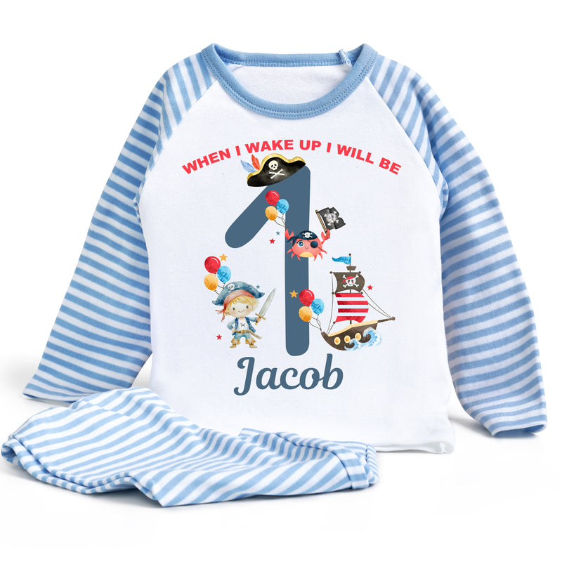 When I wake Up I'll Be 5 4 3 2 1 Personalised Birthday Pyjamas for Boy Blue Stripe Pirate Ship Design PJs In The Morning