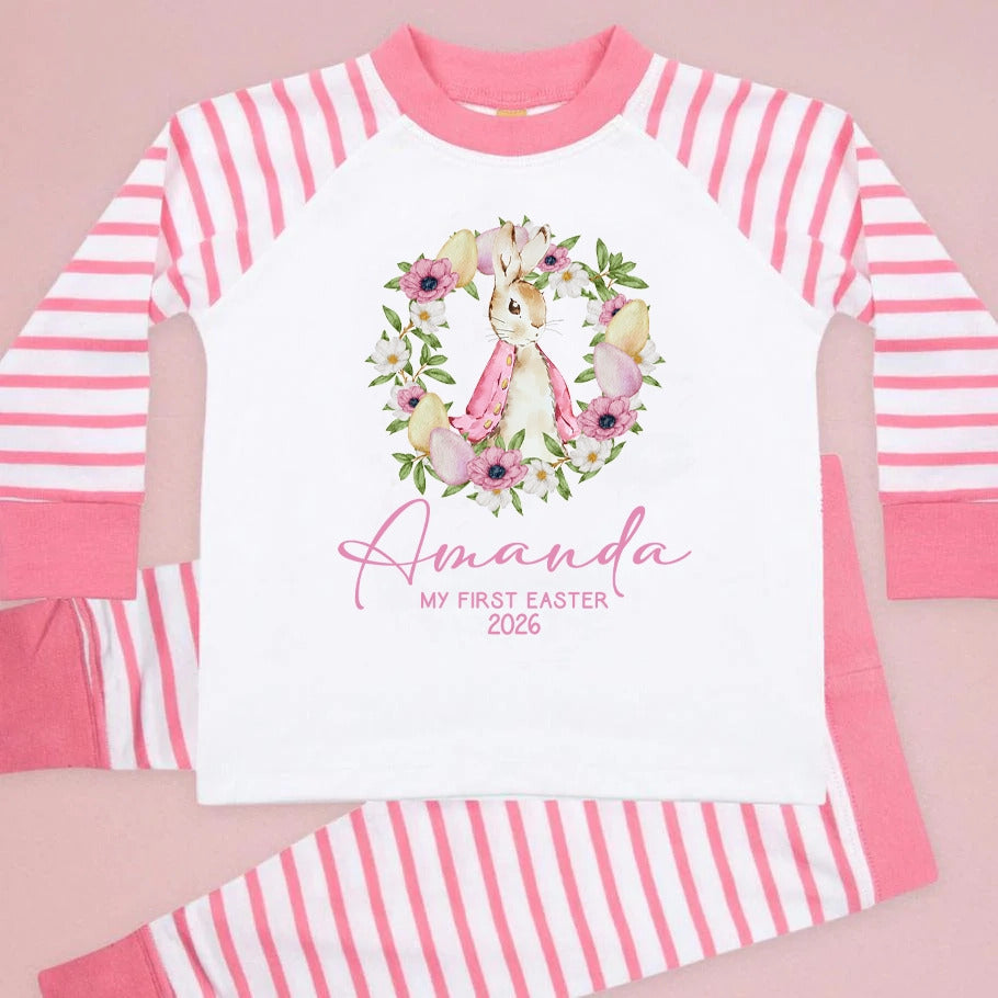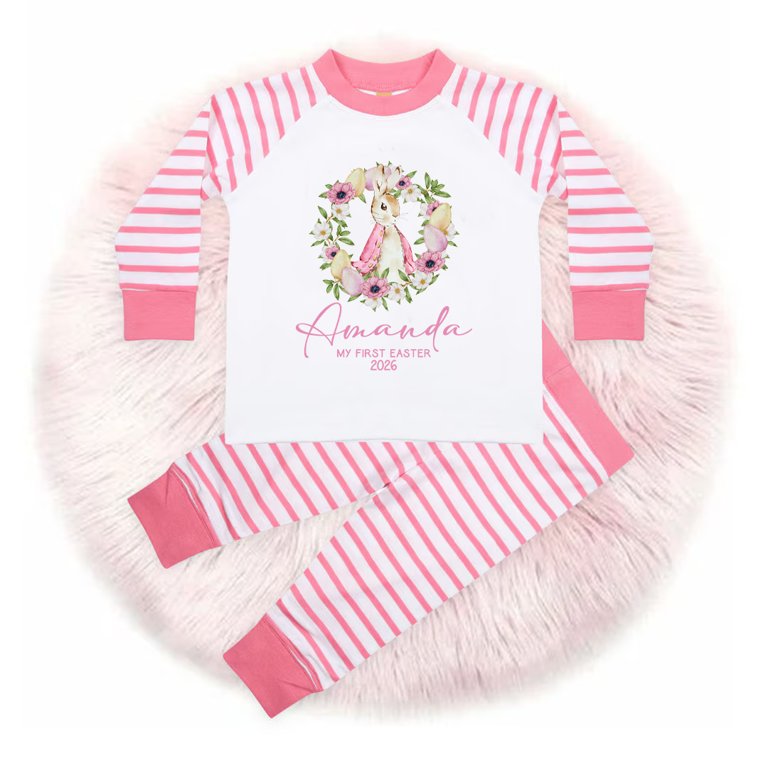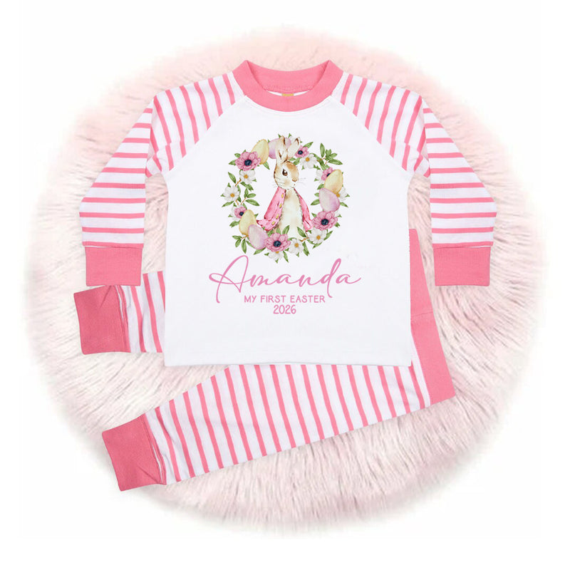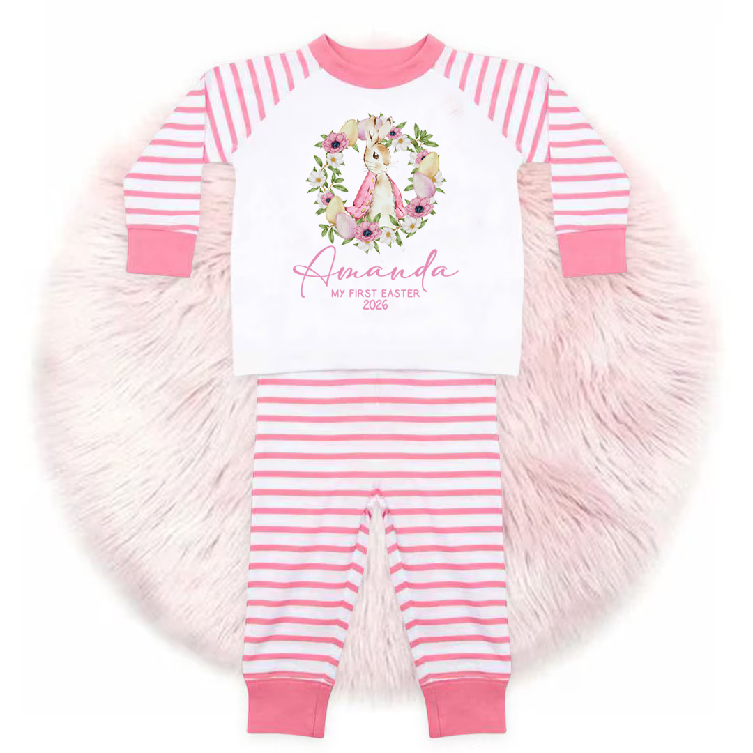 Personalised Baby Girl Pyjamas - My 1st Easter 6-12 Months Rabbit Pink Outfit Clothing Stripe PJs