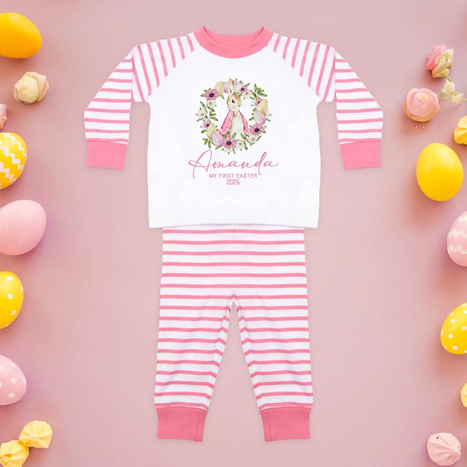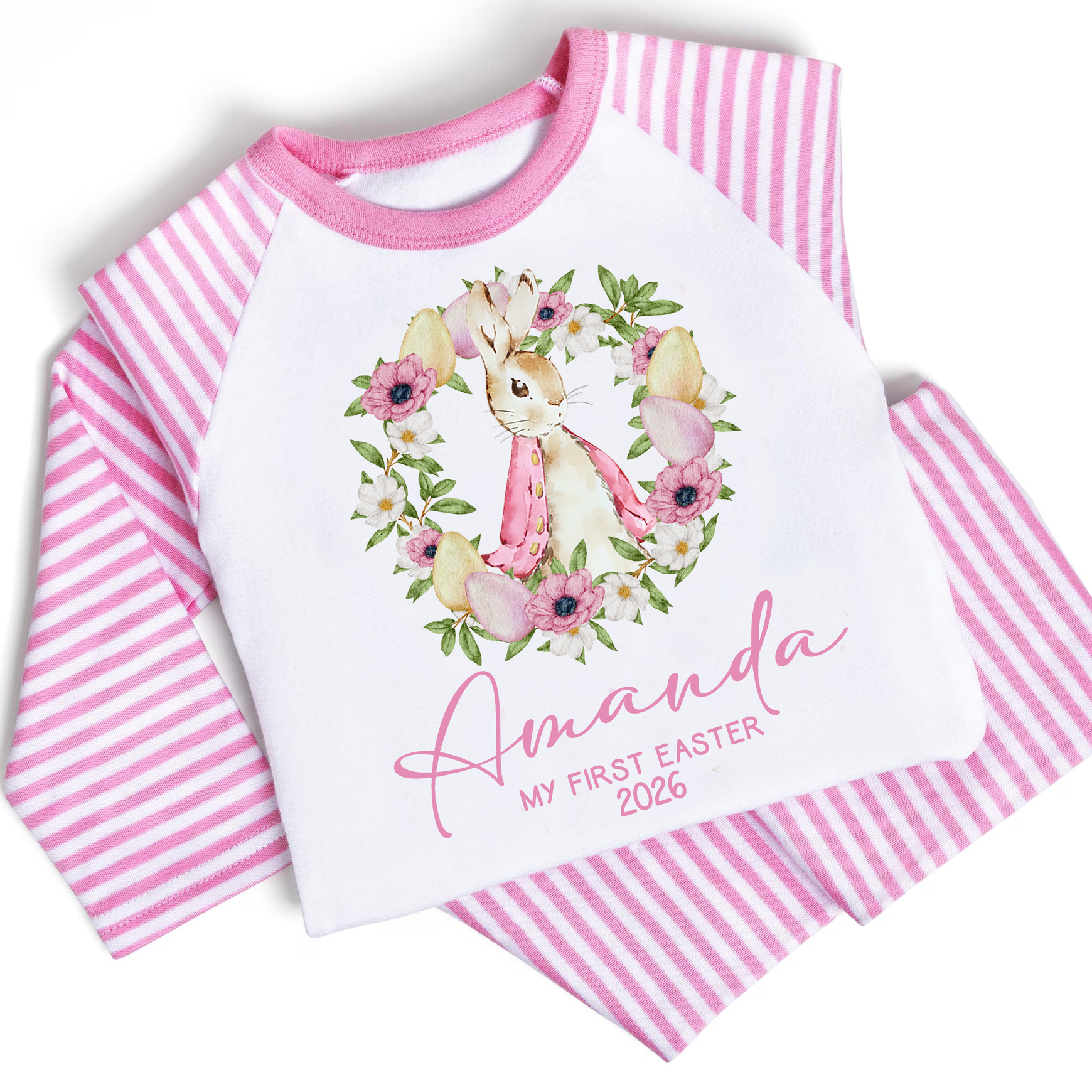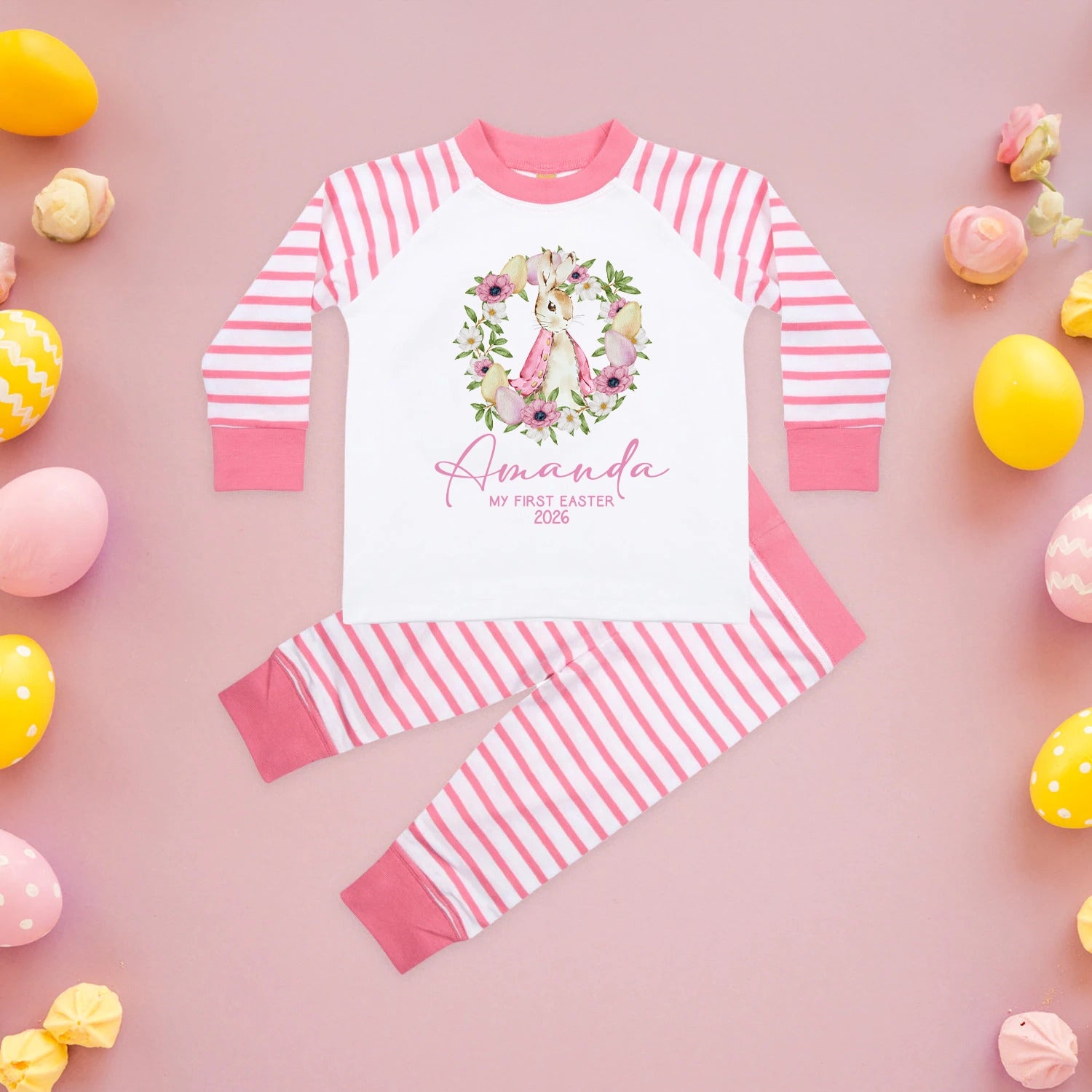 Personalised Baby Girl Pyjamas - My 1st Easter 6-12 Months Rabbit Pink Outfit Clothing Stripe PJs