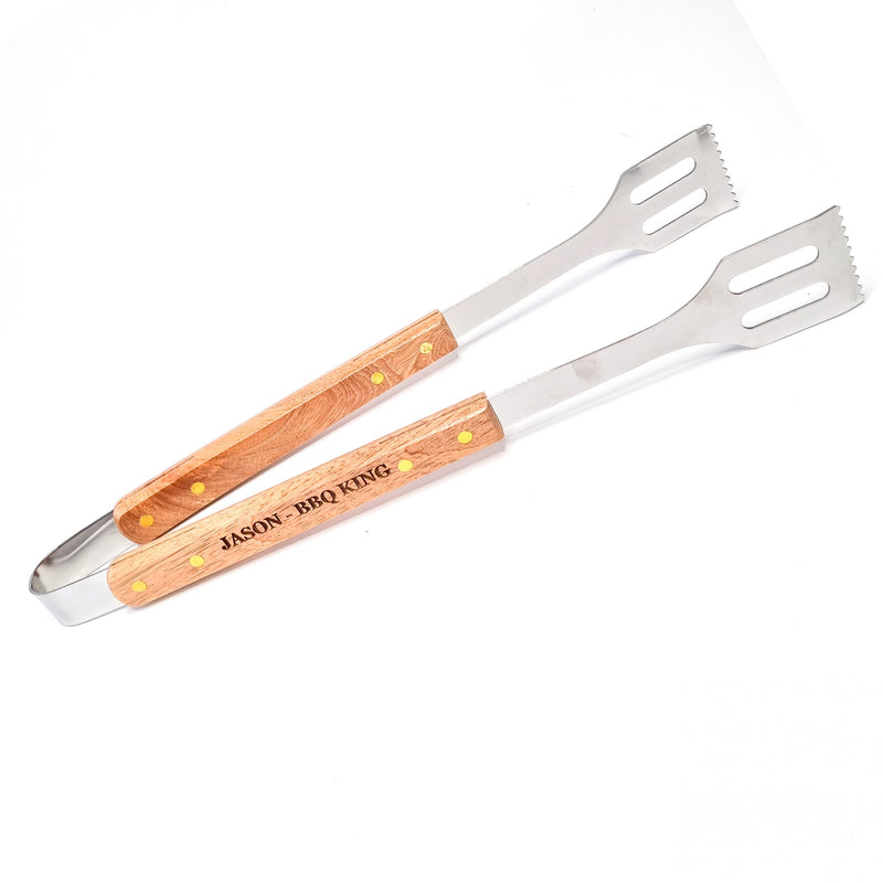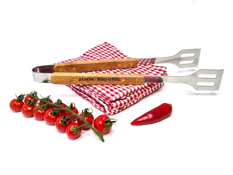 - 🍔 PERSONALISED BARBECUE TONGS - Lovely BBQ tongs with woden handles, Engraved with the text of your choice