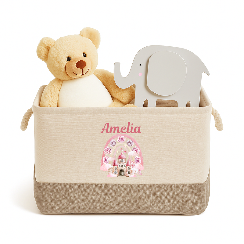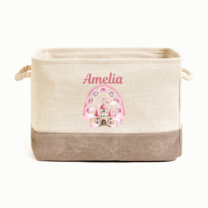 Unicorn Castle Personalised Toy Box Storage Caddy Basket Canvas With Handles Print Organiser Bin for Bedroom Nursery Playroom
