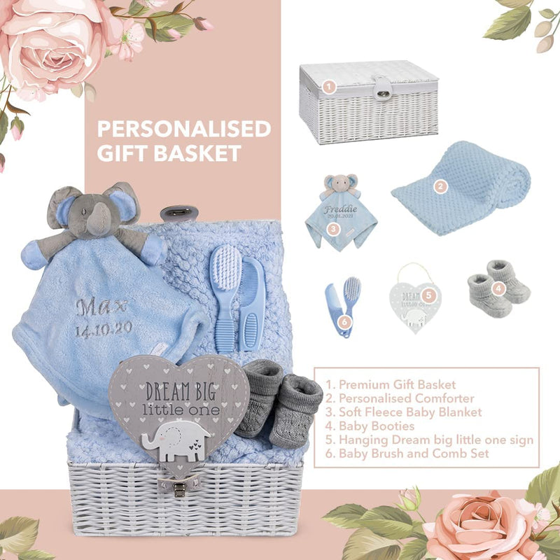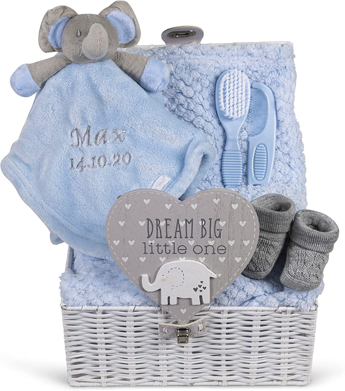 Personalised Baby Gift Basket for Boys Blue Baby Gift Hamper Basket - Large White Hamper, Blue Personalised Elephant comforter 30cm, breathable waffle supersoft cot blanket 90x70cm, brush and comb set, Baby booties, Dream big little one baby plaque