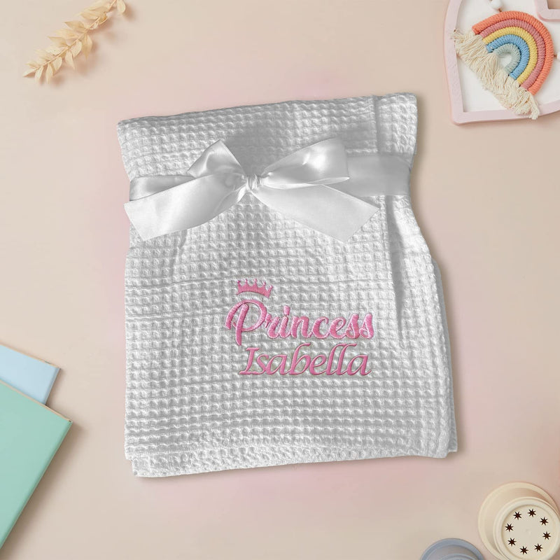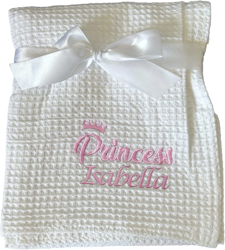 Personalised Baby Blanket Gift for New Baby Girl - Princess Design, Pink & White Waffle Wrap, 100% Cotton Newborn Present with Name