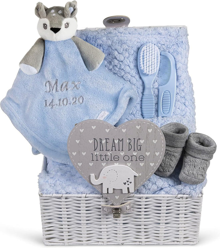 Personalised Baby Gift Basket for Boys - Large White Hamper, Blue Deer Comforter, Cot Blanket, Brush & Comb Set, Booties, Plaque