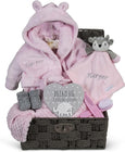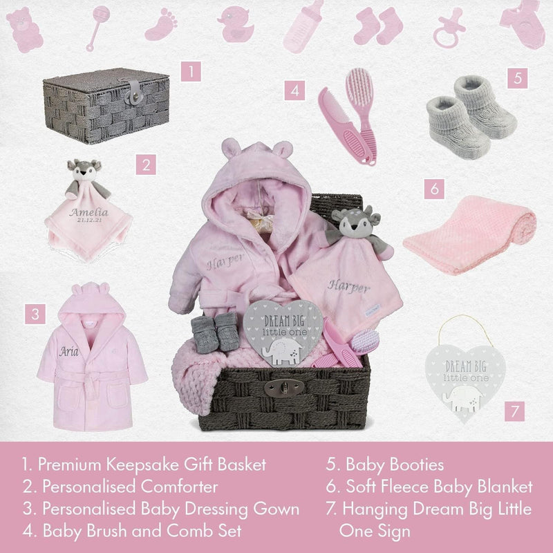 - Personalised baby girl hampers gift basket - The gift set comes beautifully presented in a coordinated gift hamper basket which can be used for storage or keepsakes. Baby Hamper Girl Gift Basket.