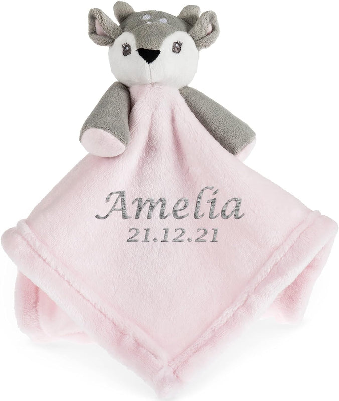 - Personalised Blanket - The pink deer comforter is personalised in silver embroidery with the name of your choice as shown (max 2 words) these make great keepsake toys a lovely personalised new baby girl gift which will be treasured for many years. suitable from birth.