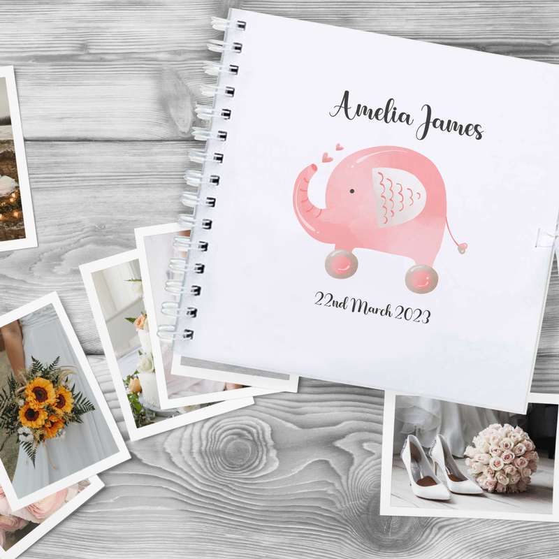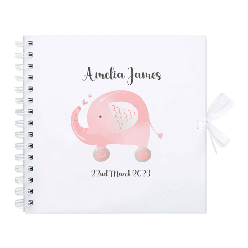 Personalised Baby Girl Pink Elephant DIY Handmade Scrapbook Album for First Year Memories Gift - White Photo Album Scrap Book Newborn 20cm