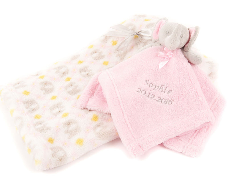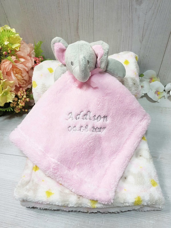 Personalised Embroidered Baby Comforter Pink Elephant + Blanket Gift Set Baby