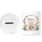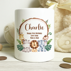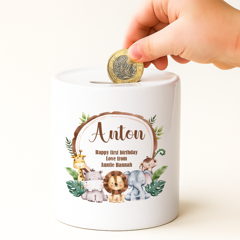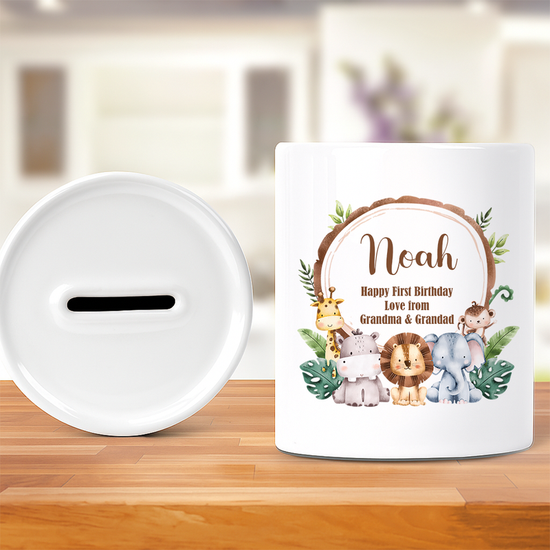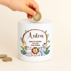 Personalised Money Bank Jungle, Kids Ceramic Money Box Customised Gift Baby Child 1st Birthday