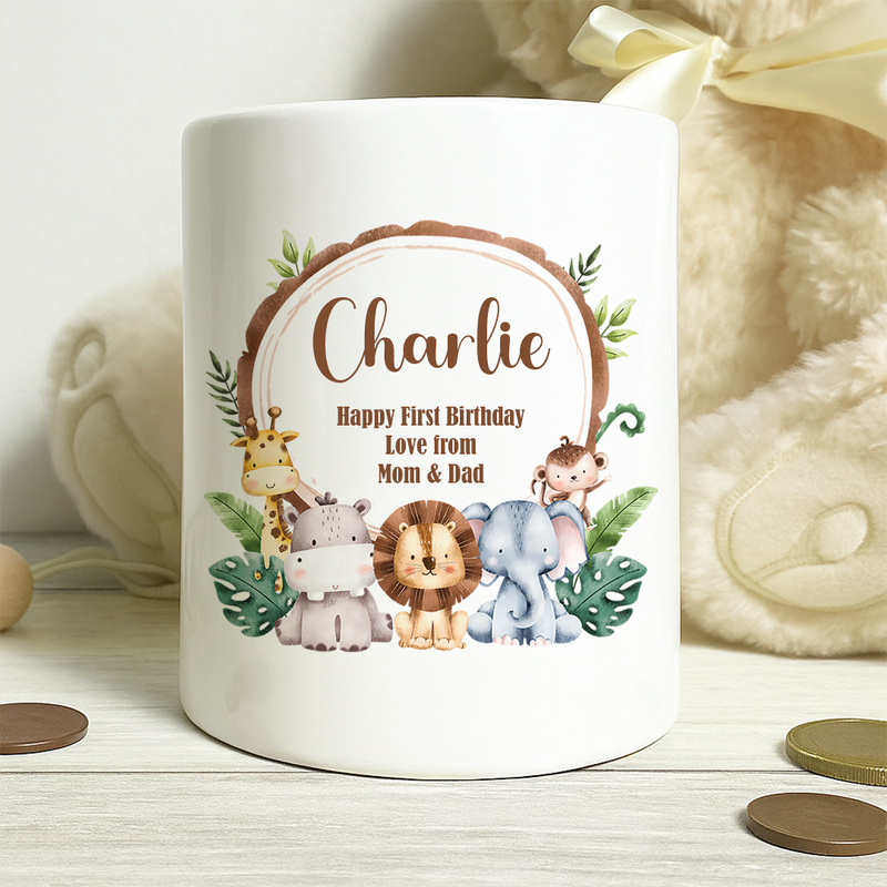 🦁 Custom Design for a Lasting Gift - Celebrate special moments with this personalised jungle-themed ceramic money bank, tailor-made with your child's name for a one-of-a-kind keepsake they’ll cherish forever.