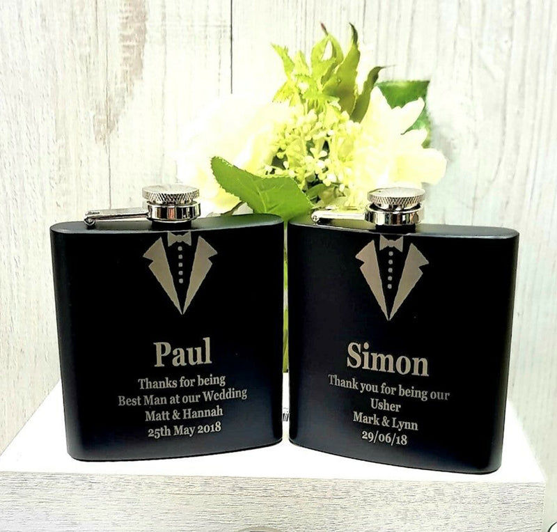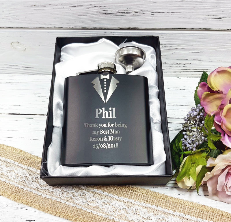 Personalised Engraved 6" Black Hip Flask Wedding Father of the Groom, Best Man Gift