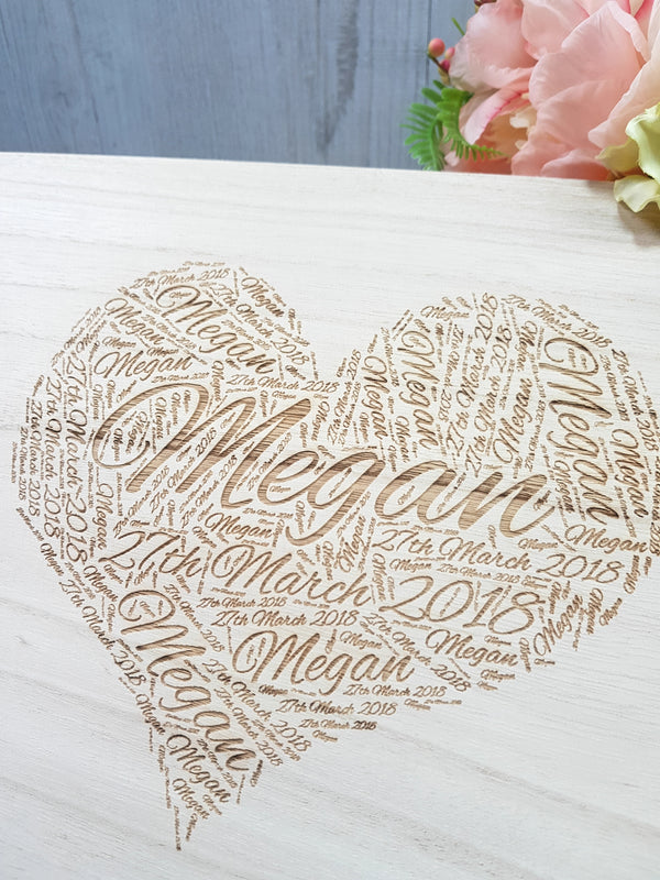 Personalised Baby Keepsake Box with Heart word cloud design 30 x 23 x 11 cm There is a handle at either side Word Cloud design as shown, Please add a message with the information you would like included. Personalised with babys details, you can provide information such as Name, Weight, Date, Time How to personalise - Add this in the boxes provided, not all boxes need to be completed just the information you want to be shown.