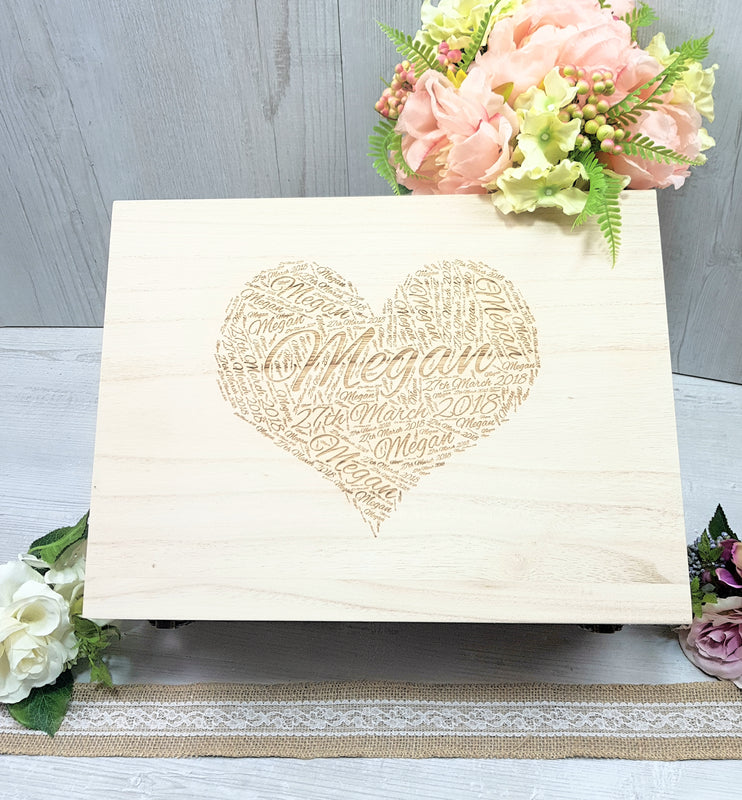Personalised Engraved Baby Wooden Birth Keepsake Memory Memory Box HEART LARGE