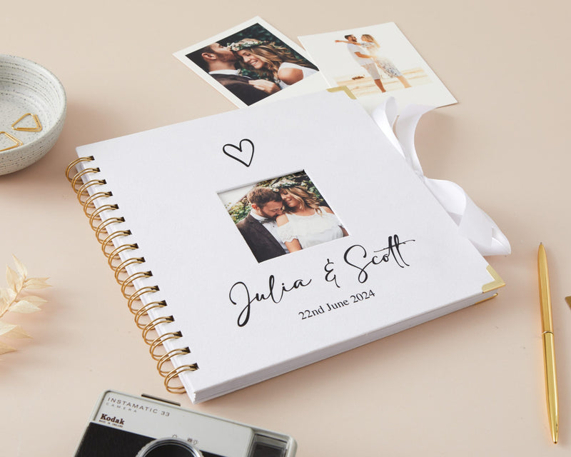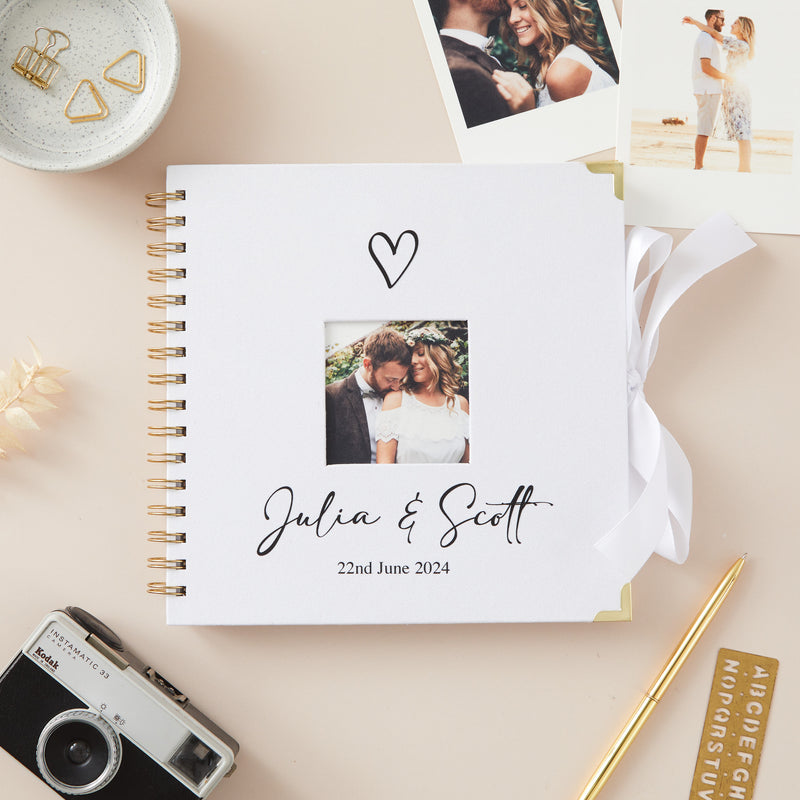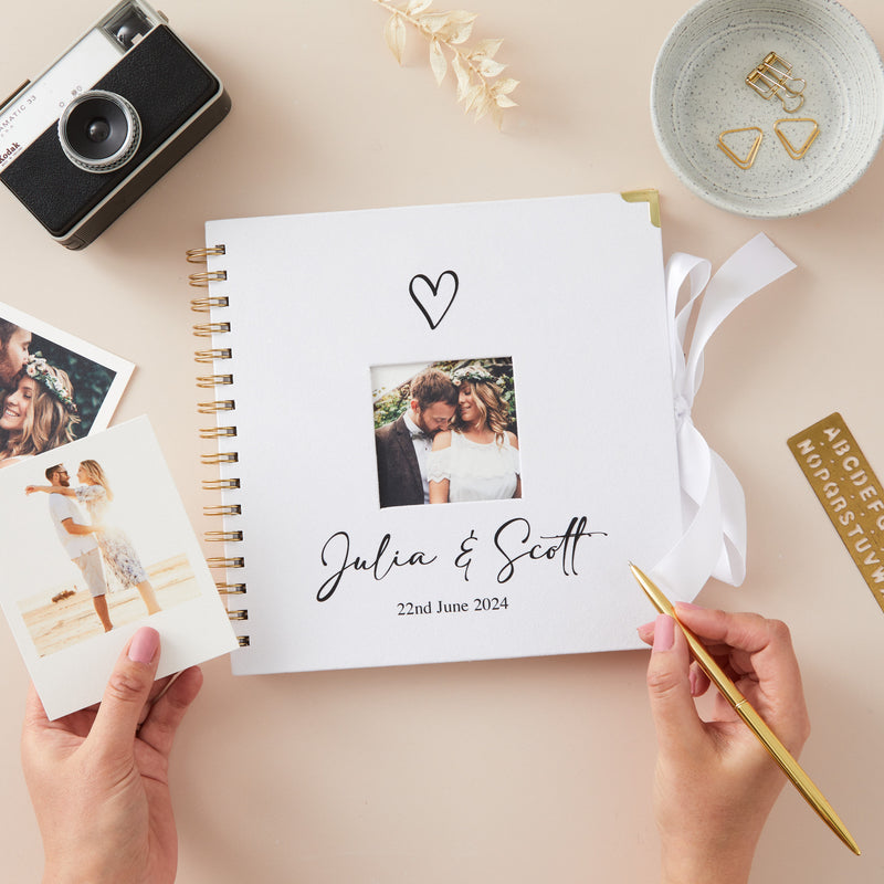 Celebrate your love story with this beautifully crafted Personalised Linen Wedding Scrapbook Album. This custom couples gift is the perfect way to capture and cherish all the special moments from your wedding day, engagement, or any other special occasion. The elegant love heart design on the cover adds a romantic touch, while the 22cm photo window allows you to showcase your favourite picture. Made from high-quality linen, this wedding scrapbook album is not only a stunning keepsake but also a durable and long-lasting piece. Whether you are looking for a unique present for a newly engaged couple or want to create a personalised guest book for your wedding, this album is sure to impress.