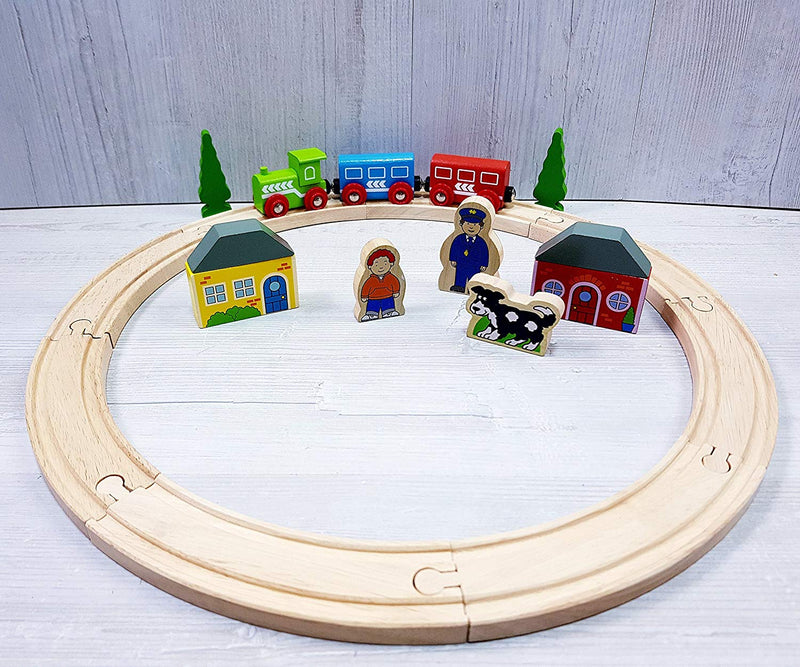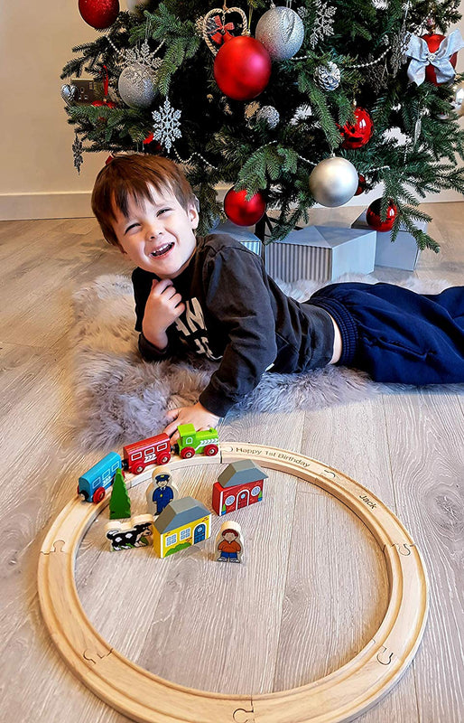 - Educational and creative, this entry-level wooden First Train Set will open young minds to an endless world of adventure. Comprising eight pieces of track, an engine and two carriages, there are also seven free-standing items to create a unique travel scene with each play. In total 2 pieces of track are custom engraved with your message on. Age 3+
