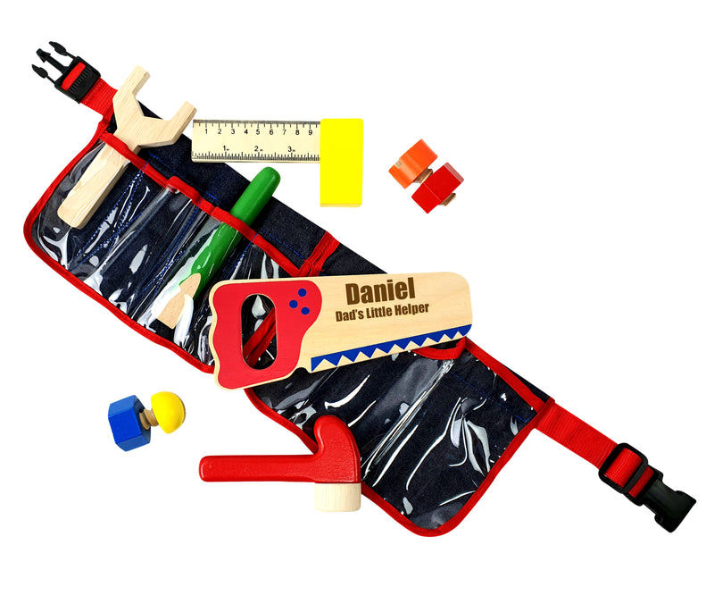 - This personalised first Tool Belt consists of safe wooden items that will allow youngsters to discover the joys of fixing and creating things. Each wooden tool is perfectly sized for little hands and is sure to fascinate your youngster. The brightly coloured belt features an adjustable clip to allow your youngster to wear their belt, leaving their hands free for creative role play. Helps to develop dexterity and co-ordination. Made from high quality, responsibly sourced materials. Conforms to current European safety standards. Consists of 10 play pieces