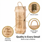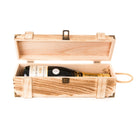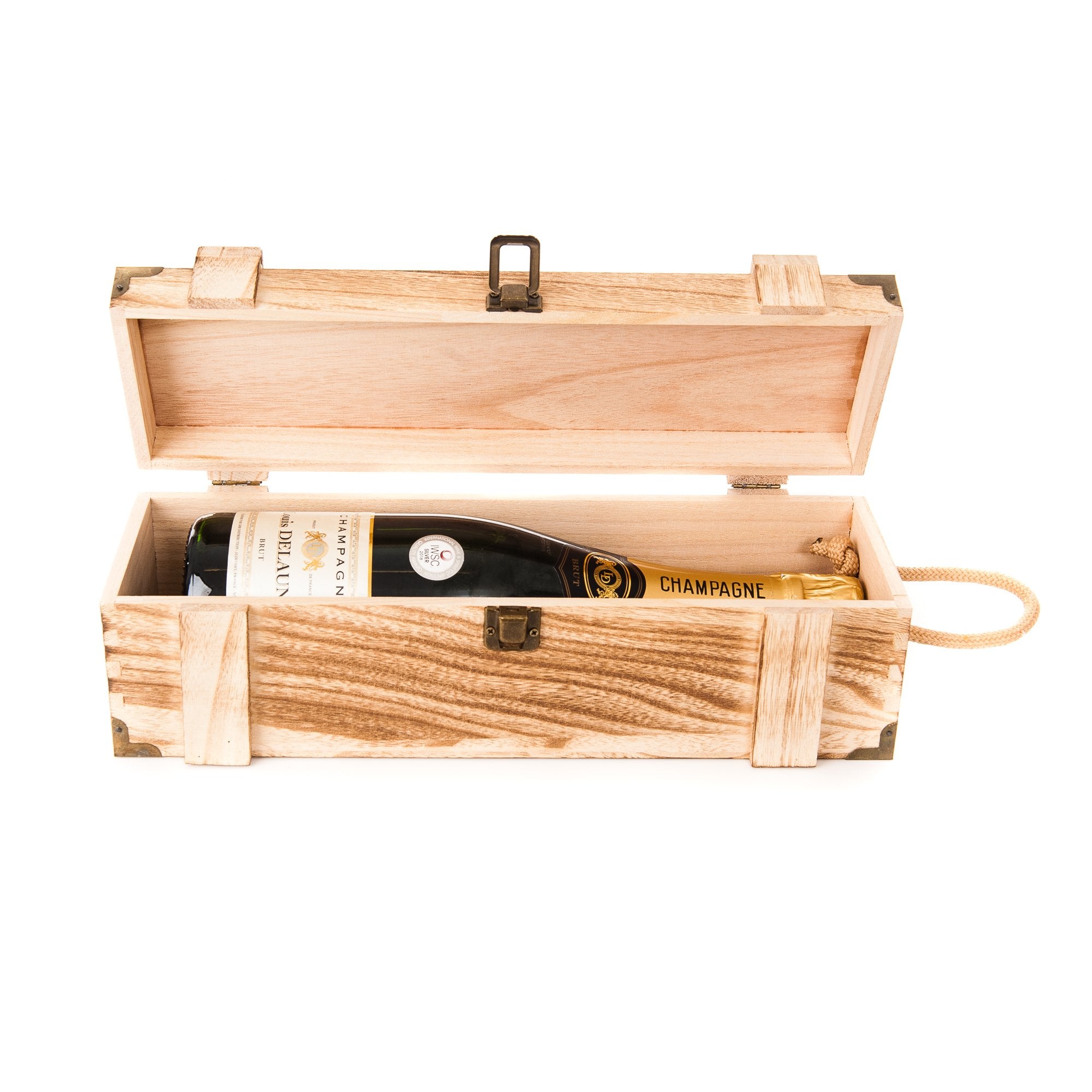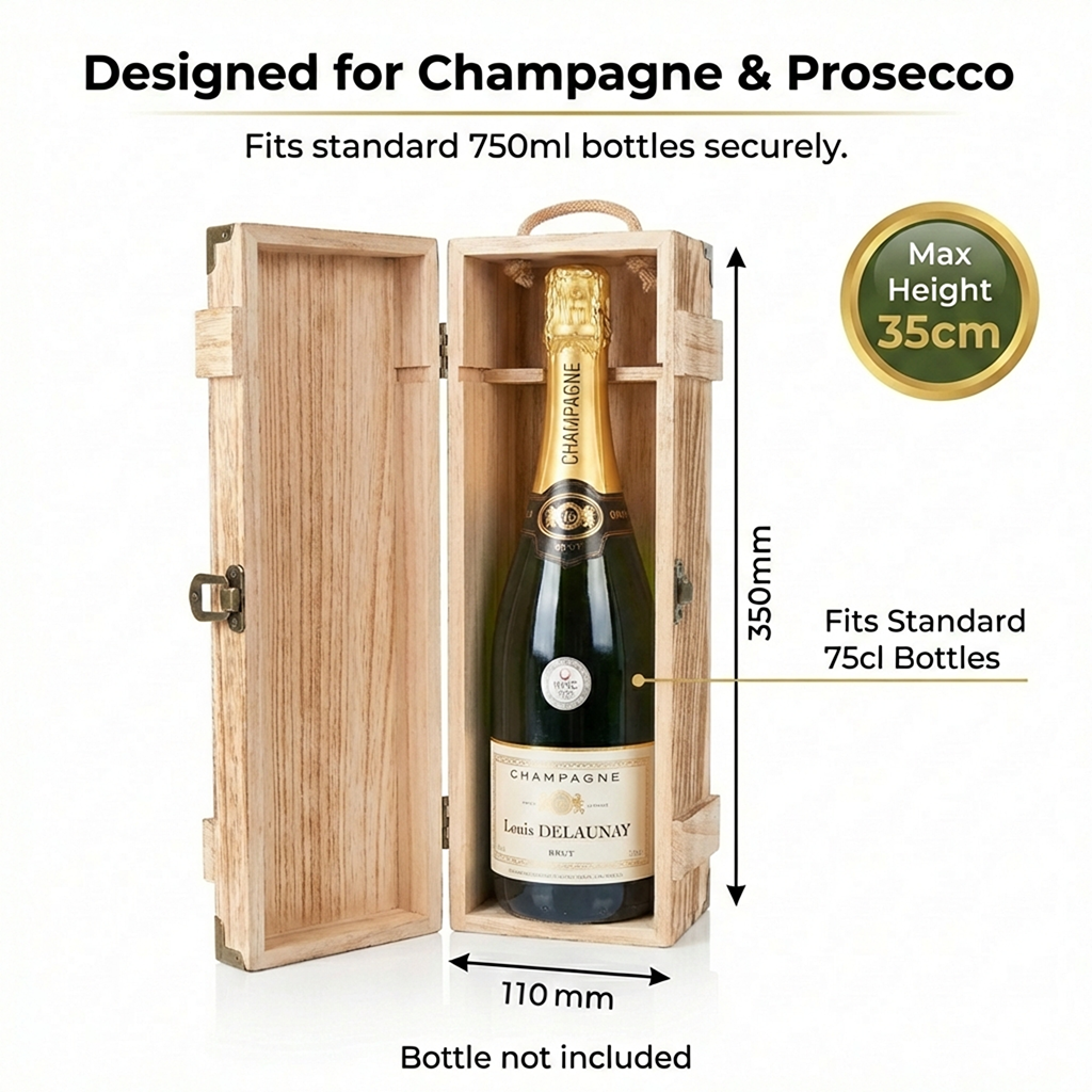 - Wooden with dovetail joints, metal clasp, rope handle, 2 x metal hinges Size: (L x W x H) 360 x 120 x 100mm, Fits Wine Champagne Prosecco and similar size/shpe bottles.