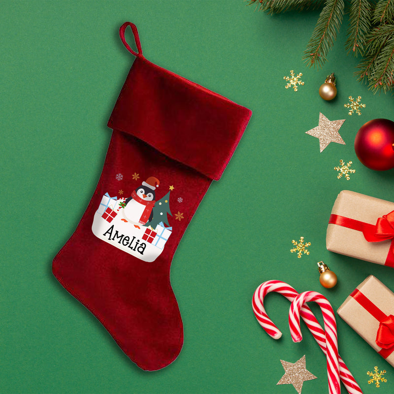 This Personalised Christmas Stocking for Kids, Baby, and Toddler is the perfect way to make your little one's holiday season extra special. Crafted from luxurious red velvet, this festive stocking features a charming penguin design that will bring a smile to your child's face.