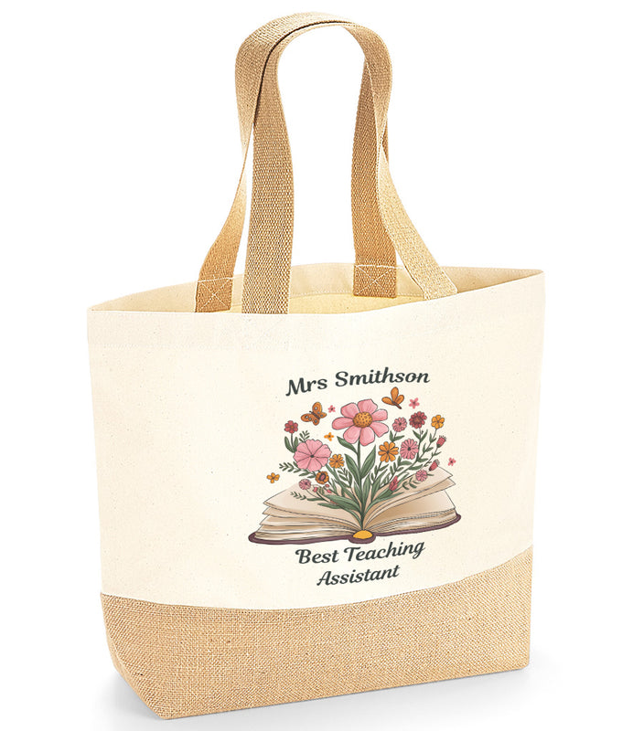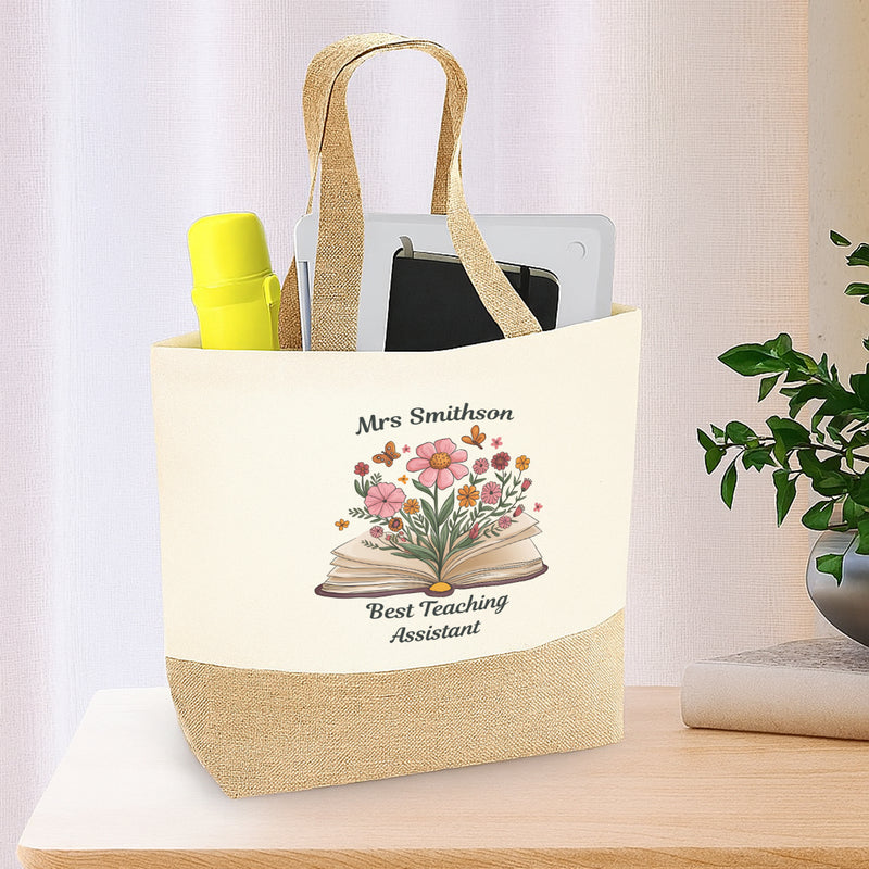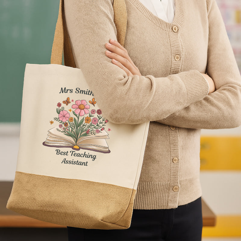 Personalised Teacher Shopping Tote Bag – Custom Gift for Teacher, End of Term Thank You Present, Flower Design, Unique Tutor, Pupil Gift, Year Leaving, Teaching Assistant Appreciation