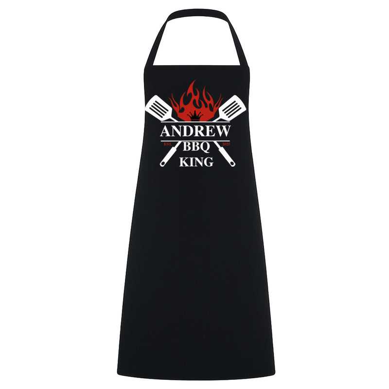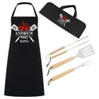 Personalised BBQ King Gift Set - 3 Piece Stainless Steel BBQ Tongs Tool Set with Wooden Handles & Custom Apron - Ideal Present for Men