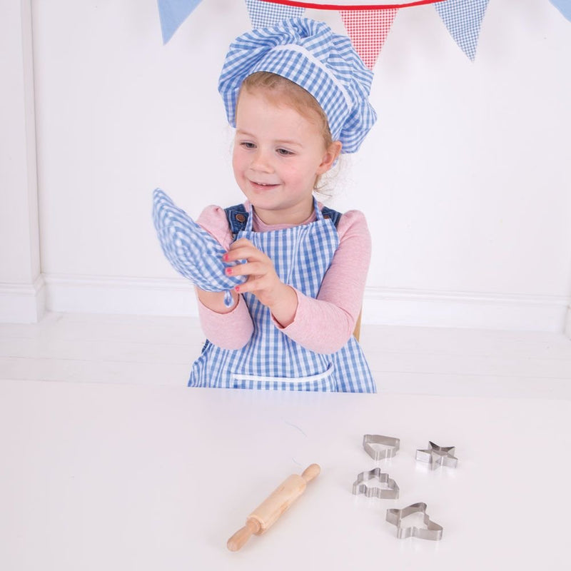 Keep your budding young chef clean and tidy in the kitchen with this personalised Blue Chef's Outfit. This fun role play set will delight any youngster and ensure they look the part whilst cooking up a storm! Featuring 8 play pieces, this set includes an apron, chef's hat, oven glove, four pastry cutters and a sturdy wooden rolling pin. Great for use in the play kitchen, or even the real kitchen! Perfect for parent/child interactive play sessions. Encourages creative and imaginative role play. . Conforms to current European safety standards. Age 3+ years. Apron Length: 560mm. Consists of 8 play pieces.