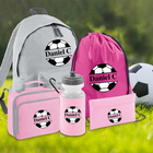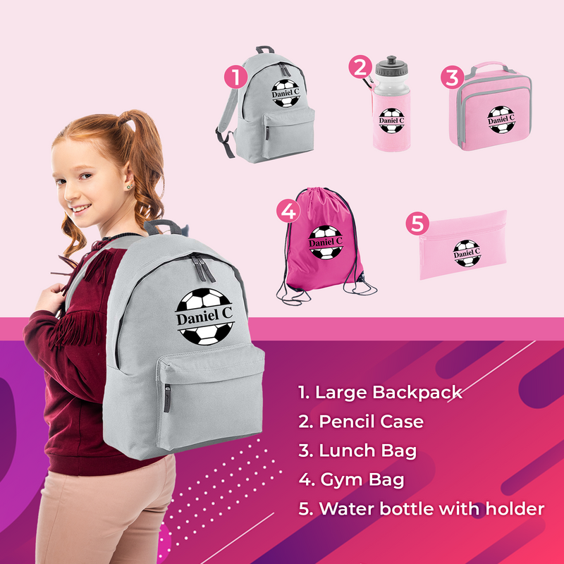 Personalised Girls Football Design Back to School Set, Custom Name BackPack for Kids, Water Bottle, PE, Gym Bag Box for Girls , Large Capacity Insulated Lunch Bag, Pencil Case Name Pink Grey