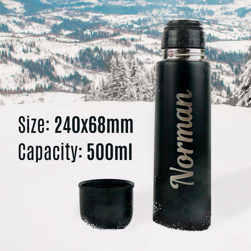 Personalised Hot Drink Flask Reusable Thermal Mug and Cup Lid - Engraved Personalised Gift - Hot Water Tea Coffee On The Go - Car Travel Mug - Black Insulated Stainless Steel Vacuum Flask