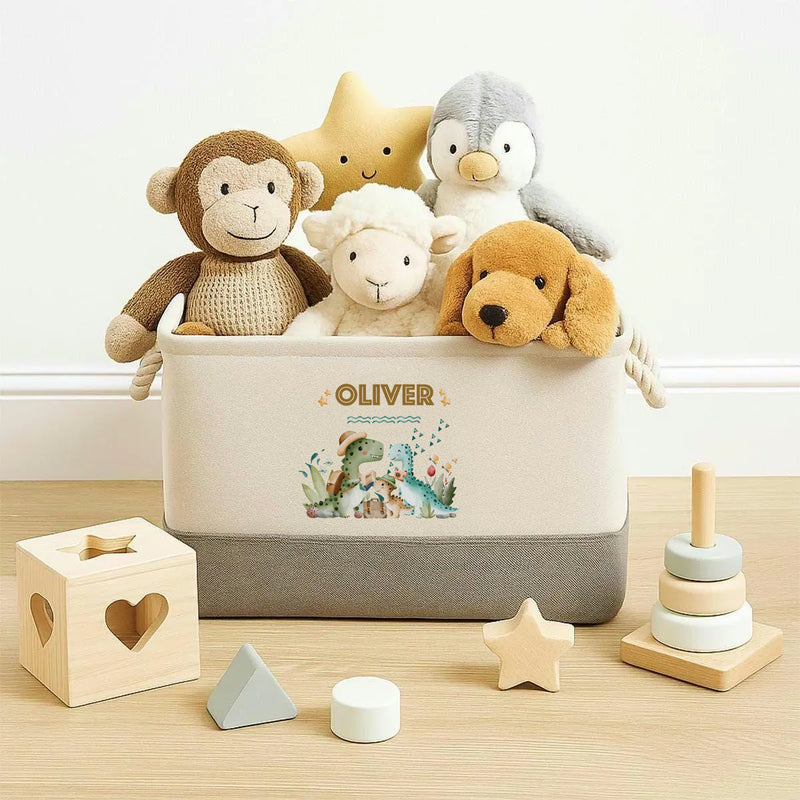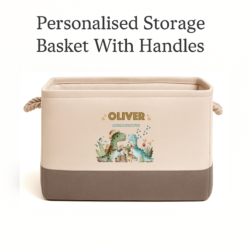 Personalised Dinosaur Kids Toy Box Storage Caddy Basket Canvas With Handles – Custom Print Organiser Bin for Bedroom Nursery Playroom